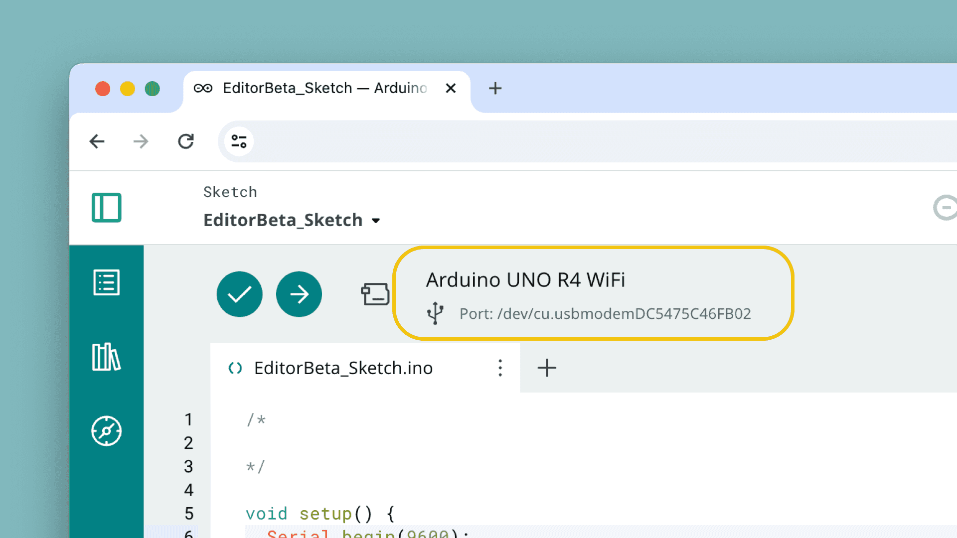 The Cloud Editor is an online code editor which is part of the Arduino Cloud. With the Cloud Editor, you can write sketches and upload them to your Arduino board, where all your progress is automatically stored in the Cloud!