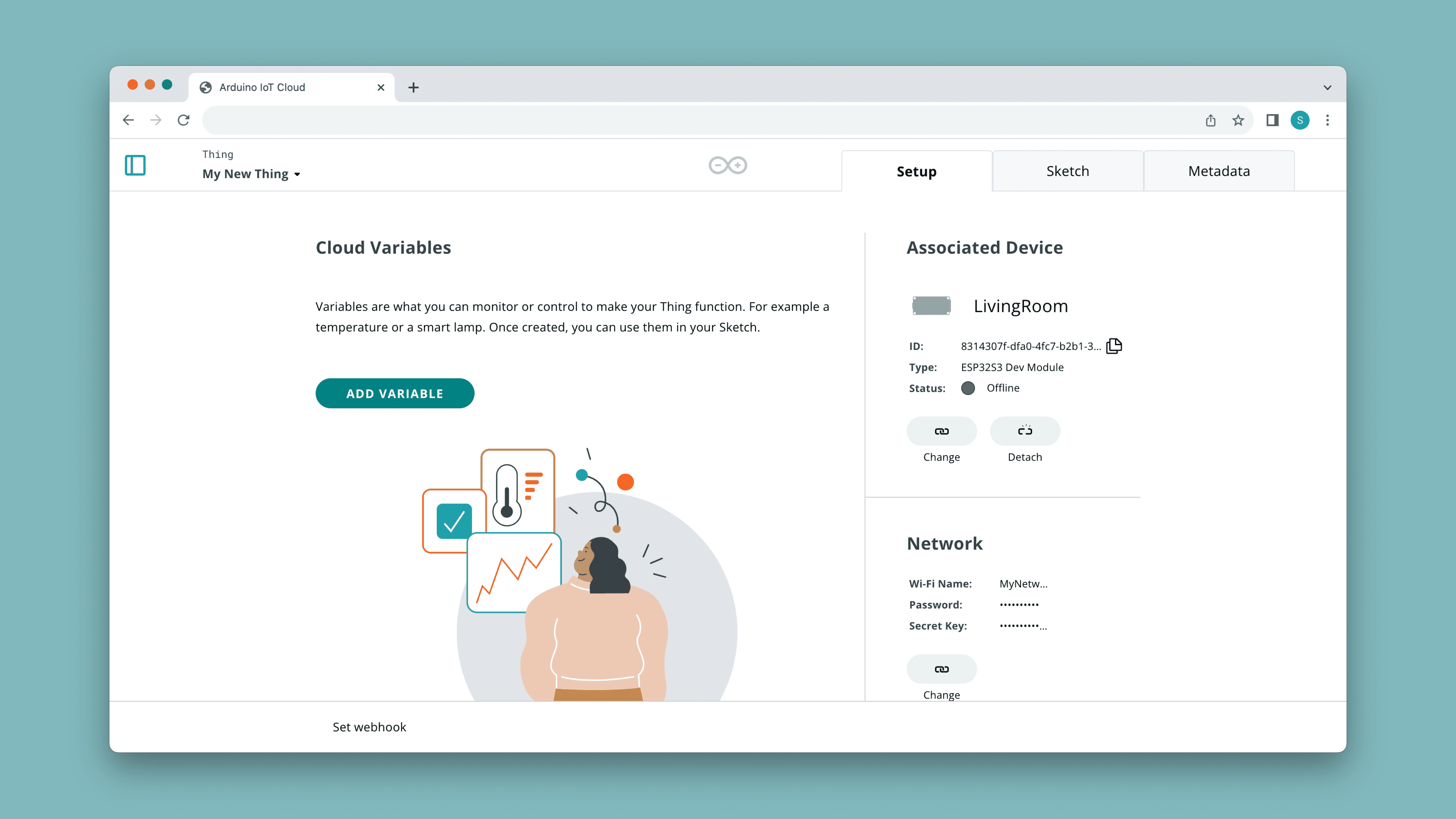 Variables we create will be used in the sketch, and will keep synchronizing as long as the board is connected to the Cloud.