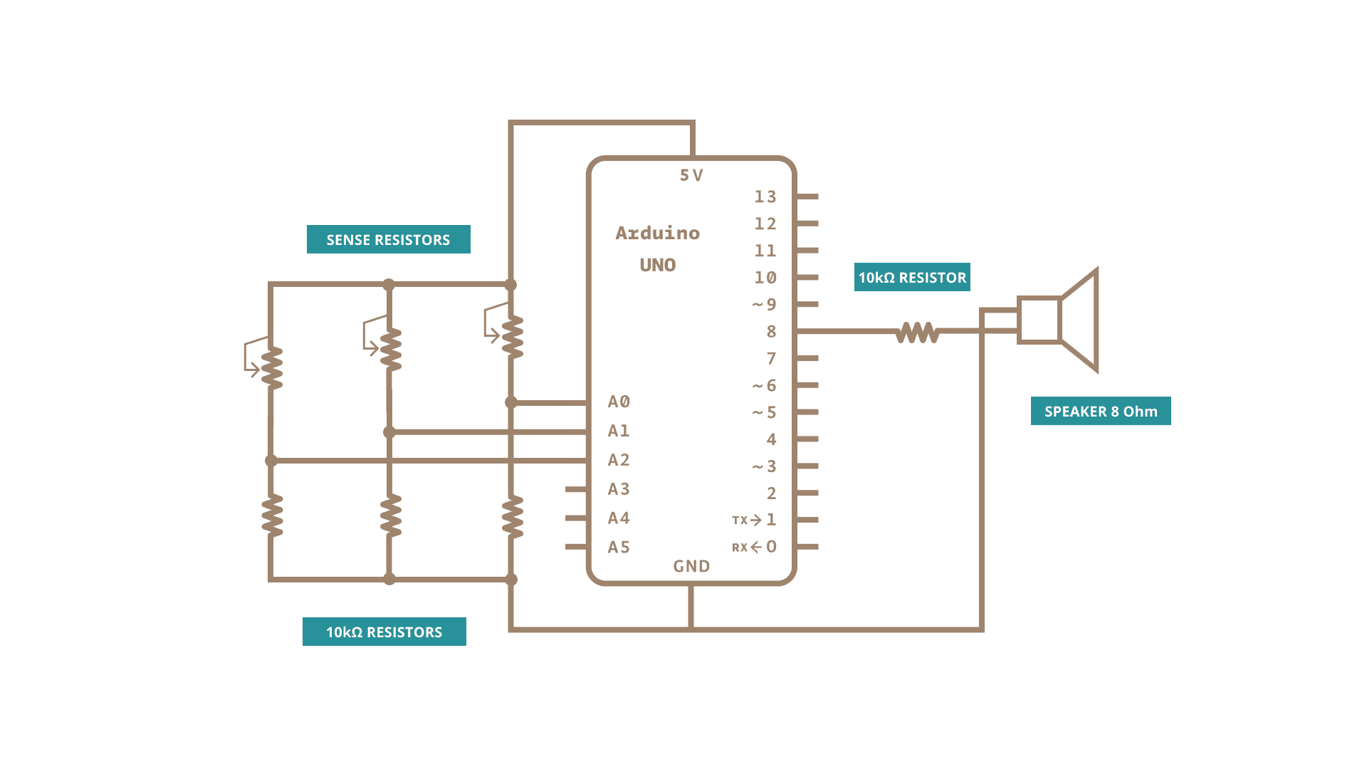 A three-key musical keyboard using force sensors and a piezo speaker.