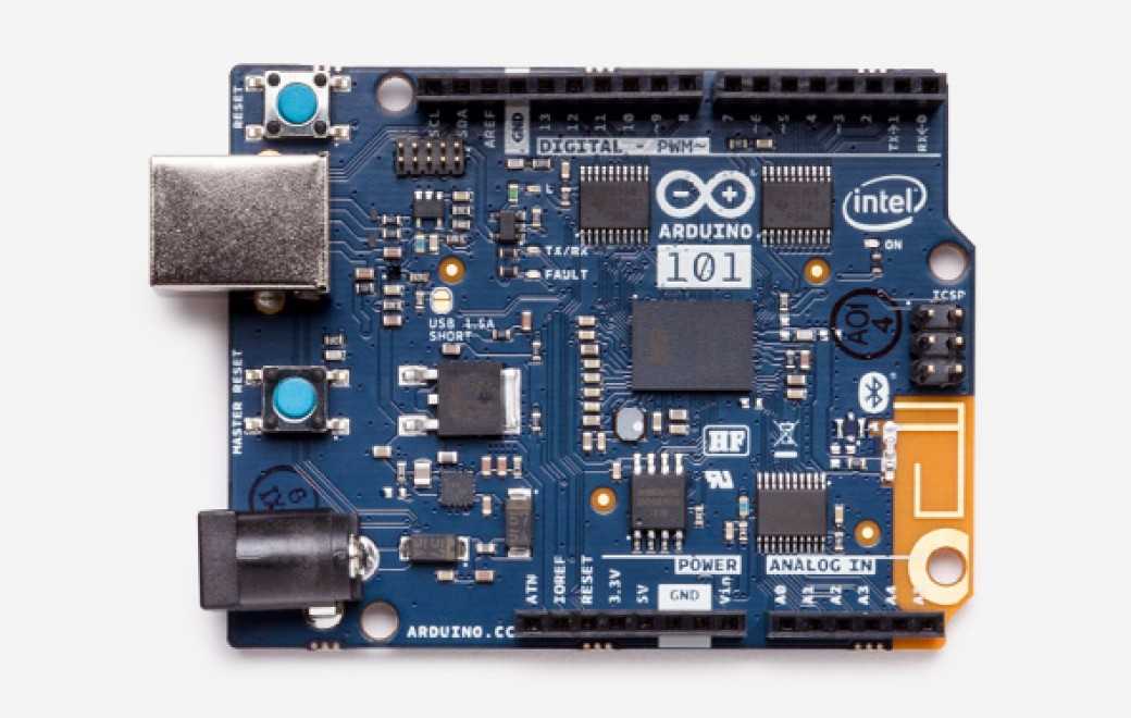The 101 has some features in common with both UNO (connectors, available peripherals) and Zero (32bit microcontroller, 3.3V IO) but the low power Intel microcontroller, on-board Bluetooth® Low Energy and motion sensors make it unique.