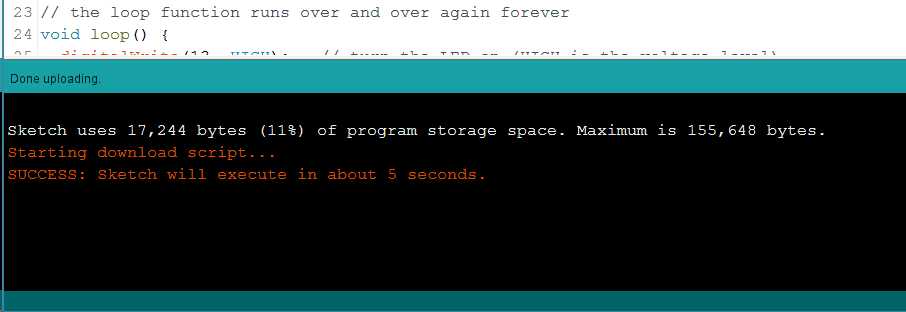 The sketch will be compiled and then uploaded. After a few seconds the bottom bar should show Done Uploading.