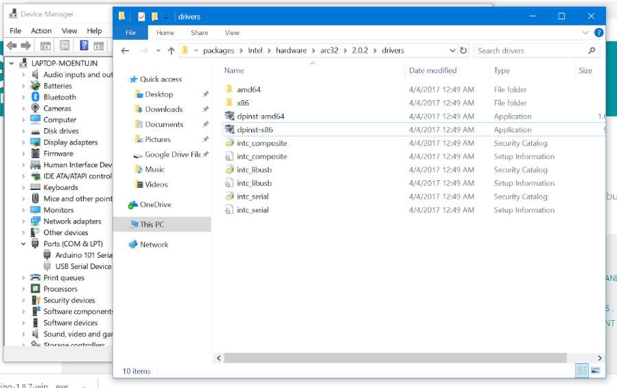Please go to your documents folder and then here: C:\Users\name\AppData\Local\Arduino15\packages\Intel\hardware\arc32\2.0.4\drivers . The folder contains the dpinst-x86.exe and dpinst-amd54.exe that are the install executables. Chose the right one for your 32 or 64 bit OS and double clic on it.