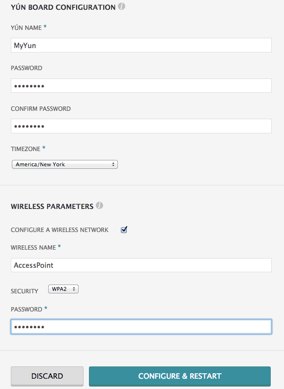 In the Yún NAME field, give your Arduino a unique name. You'll use this to refer to it in the future.