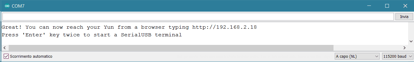 The blue LED on the shield will start to blink after a while; when the scanning process is over, the sketch will offer all the available APs in a numbered list. The time required to scan the network depends on the number of APs and their signal strength. You choose the AP to use typing in the input field the corresponding number. Please remember to enable "NewLine" in the Serial Monitor as End of Line.