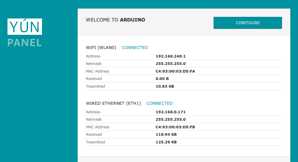 You will find a page with some diagnostic information about the current network connections. The first is your WiFi interface, the second is your ethernet connection. Press the Configuration button to proceed.