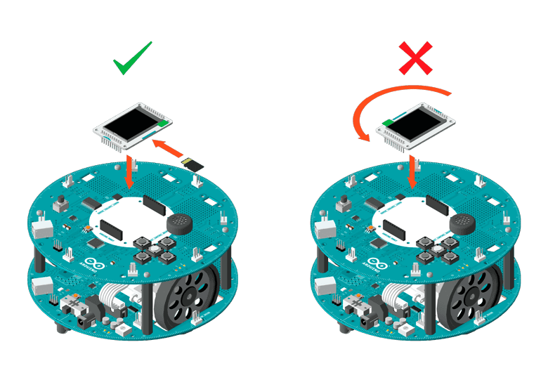 First, you'll need to insert the SD card into the slot on the backside of the TFT screen, and then insert the screen into the socket on the control board of the robot. The screen should be oriented so that the blue text with the text "SD Card" is close to the buttons and speaker.
