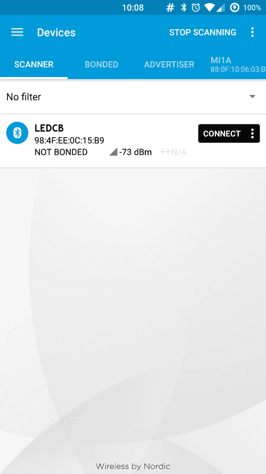 Tap on connect to open the following screen, where you find the description of our Bluetooth® Low Energy service offered by the 101 board. The unknown service has a UUID 19B10000-E8F2-537E-4F6C-D104768A1214 and it is set by the