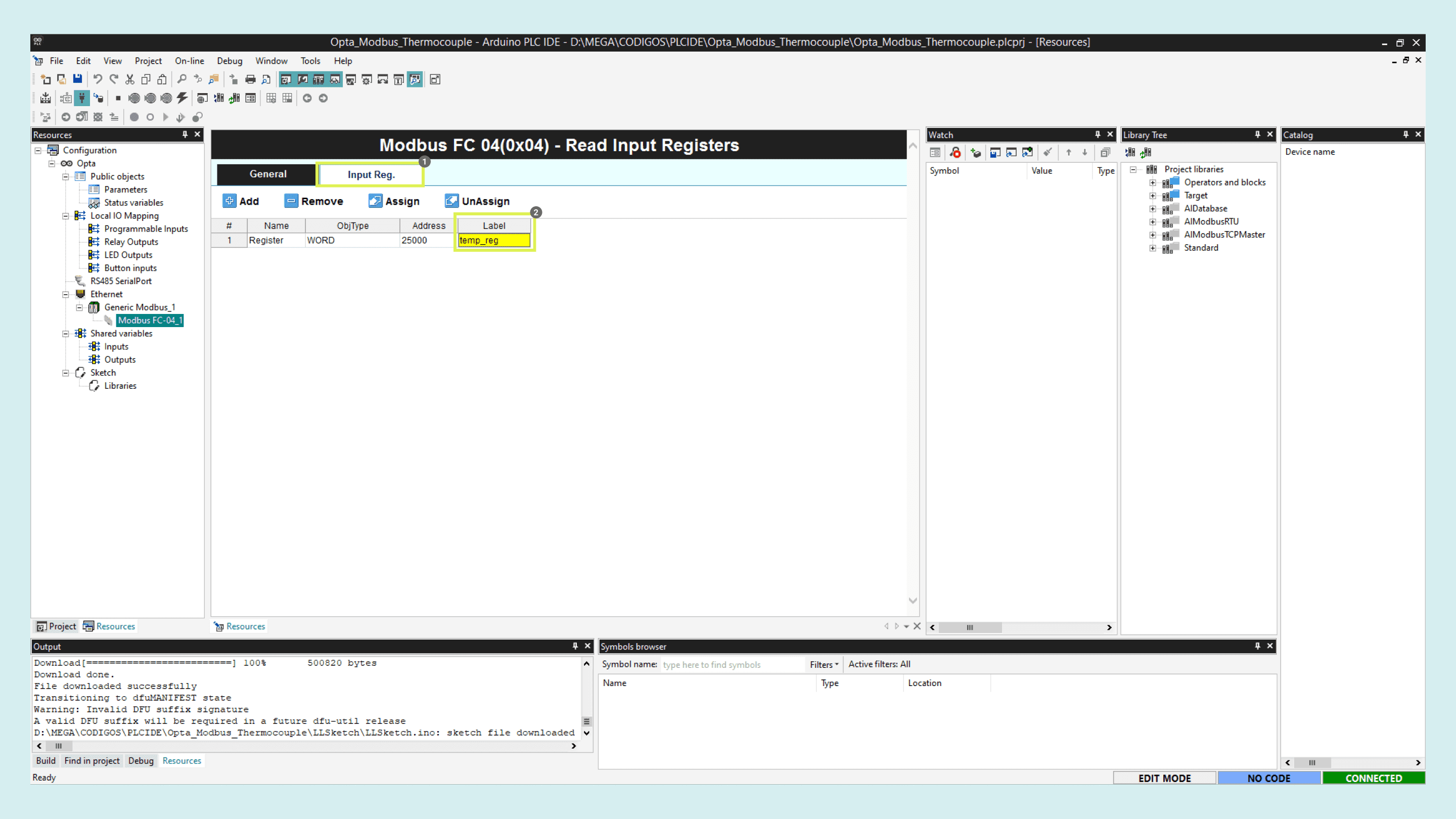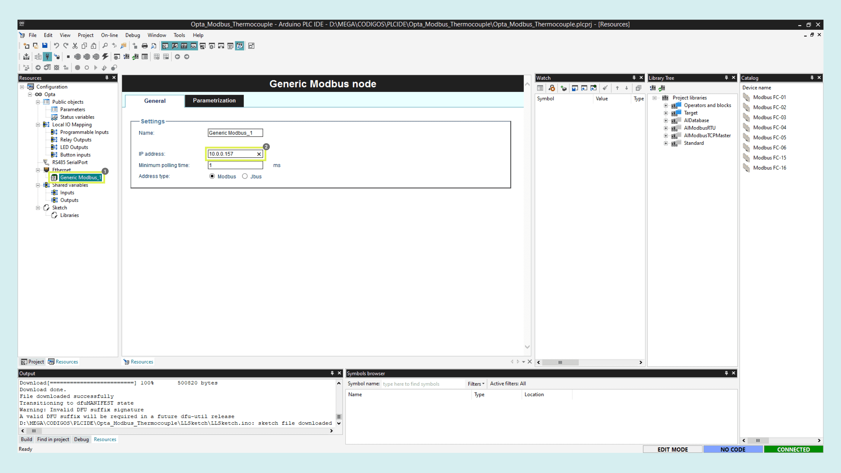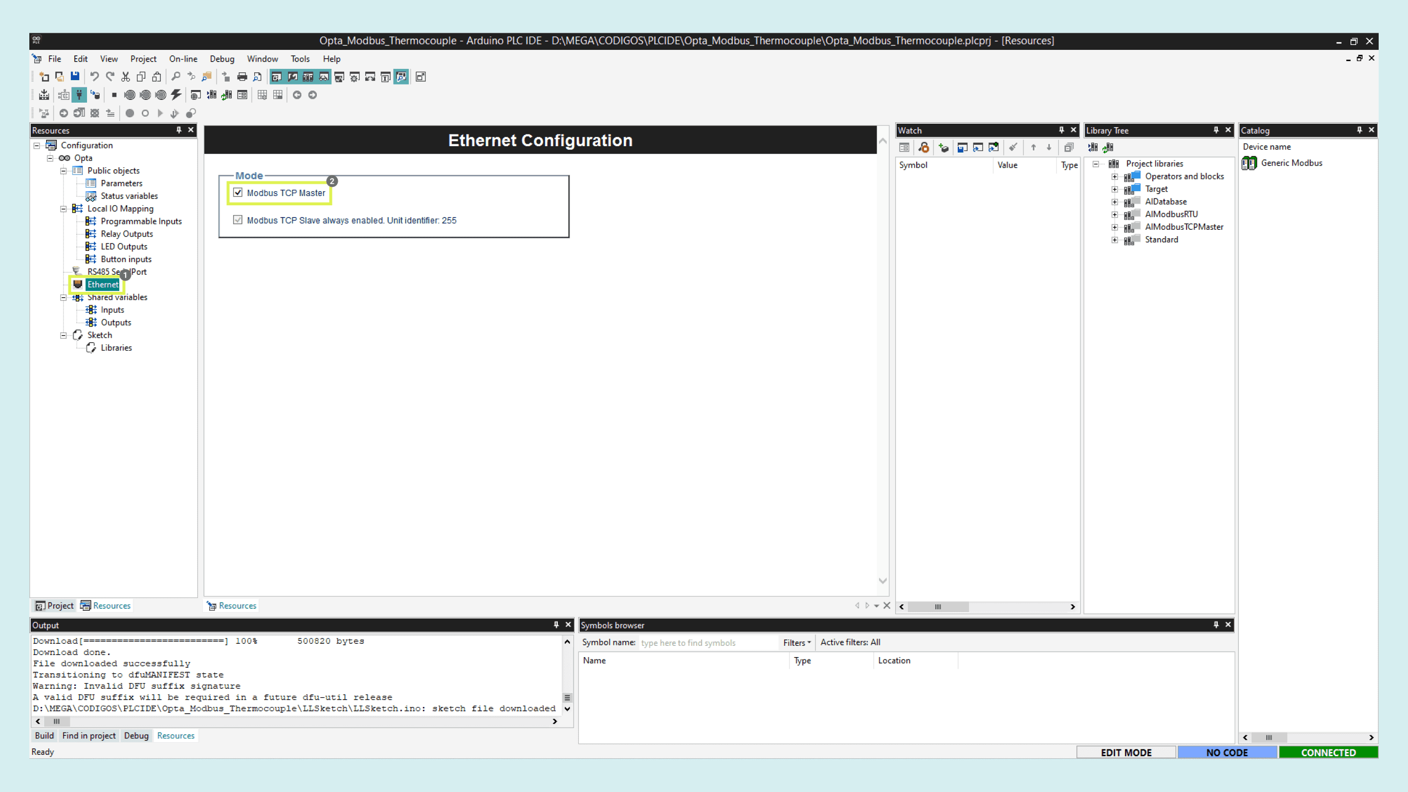 With the Opta™ successfully connected to the PLC IDE, it is time to configure the Modbus TCP communication.