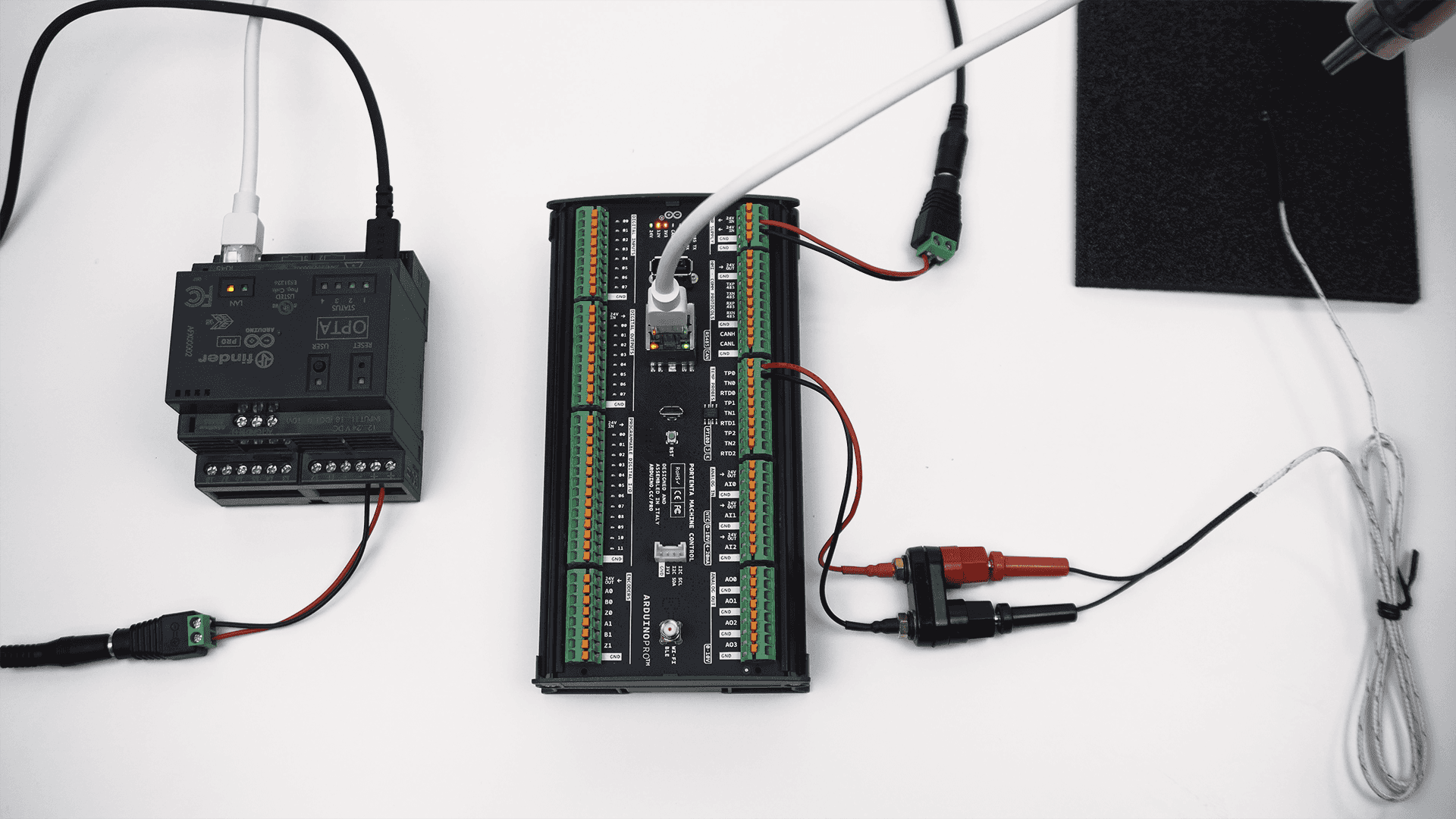 In this tutorial, a Portenta Machine Control and an Opta™ micro PLC will be used as server and client respectively to share temperature information through Modbus TCP using the PLC IDE. The server will do the measurements using a type K thermocouple and the client will activate its relay outputs when a certain threshold is reached.