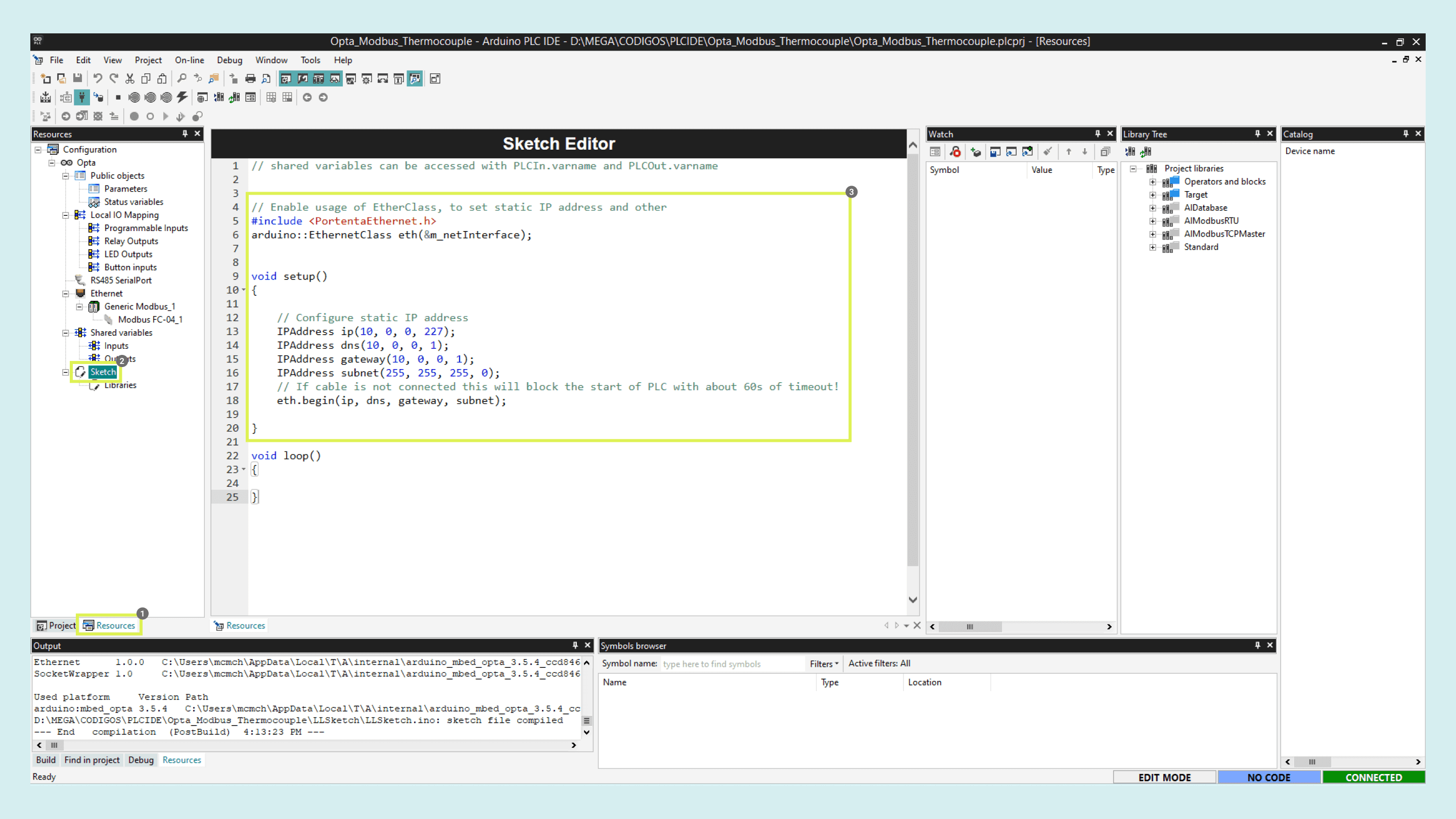 Go to the sketch editor and uncomment the library and setup function code lines. As the IP, we must use the same as the Opta™.