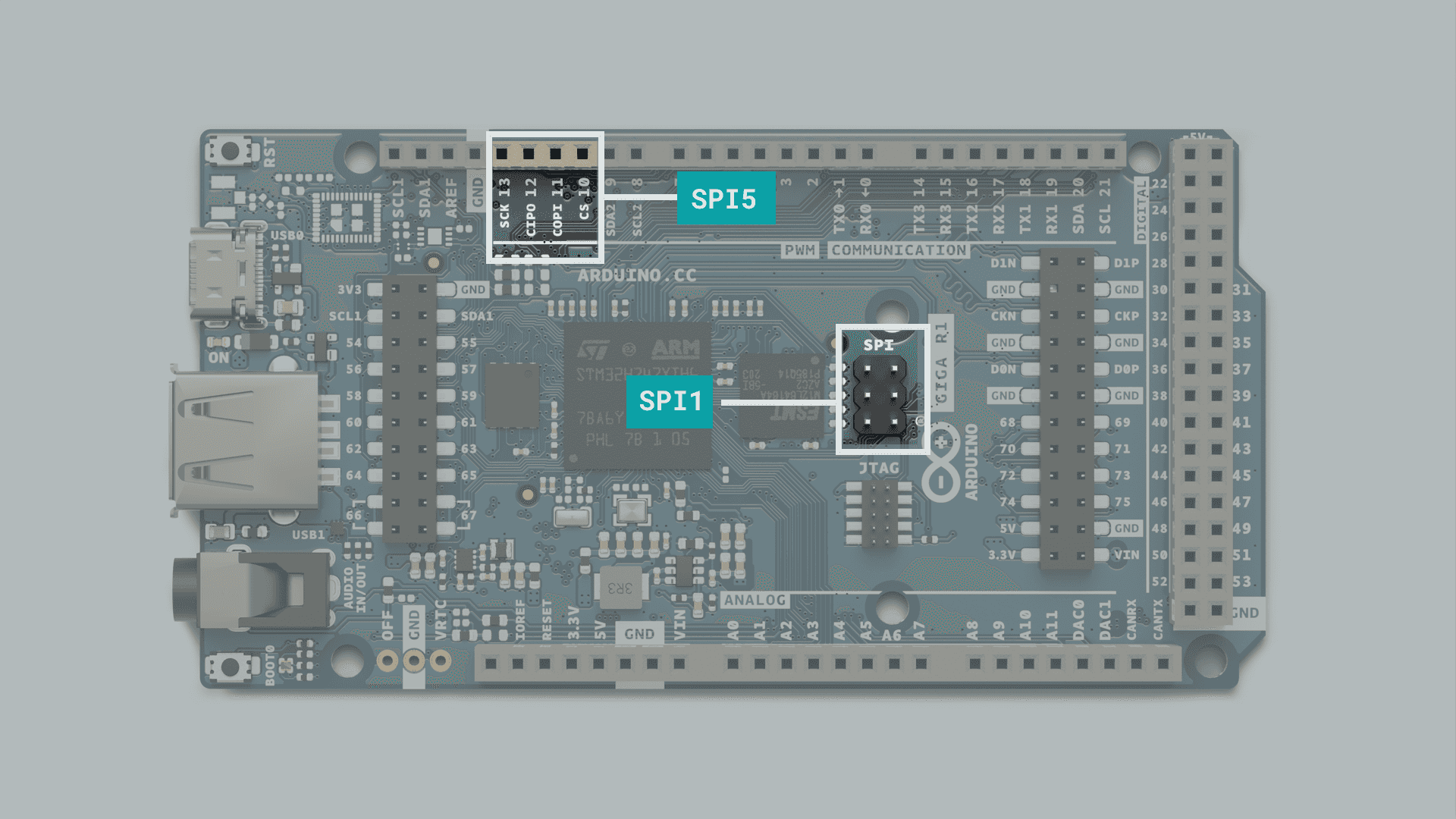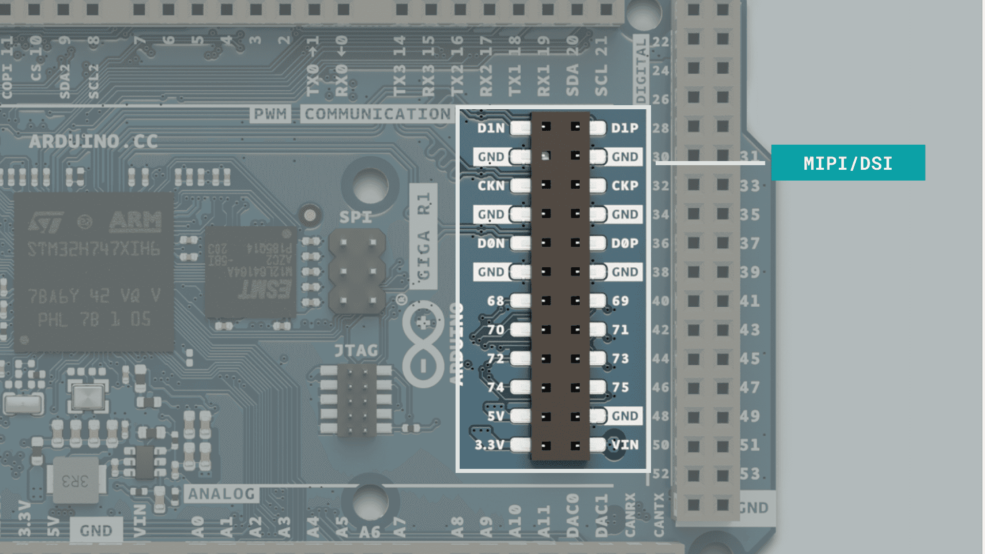 The GIGA R1 features more pins than any other Arduino board for makers, a full 76 digital pins. Though many of them serve another purpose and shouldn't be used for GPIO if you have other pins available.
