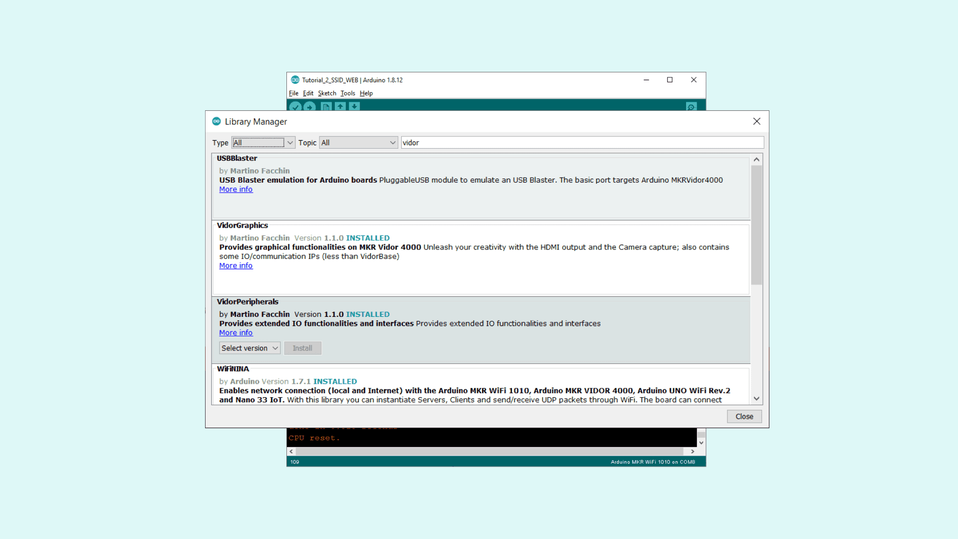 3. We will also need to add an additional library, called VidorPeripherals. Search for it in the manage libraries and install it. The author of this library is Martino Facchin.