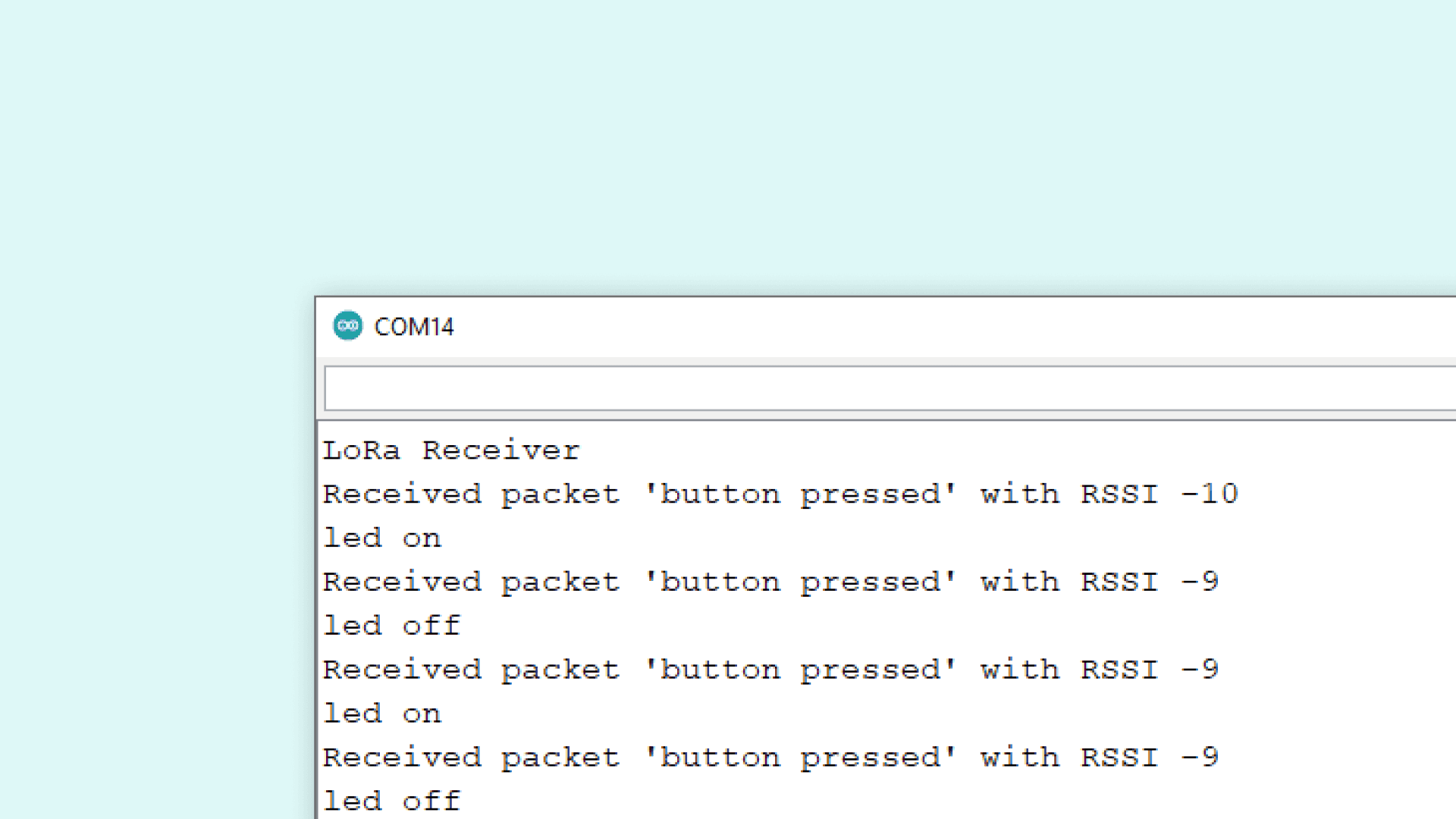 After we have uploaded the code to the receiver, we need to open the Serial Monitor to initialize the program. If everything works, we should now pick up any package we send from the other device. The package we receive should contain the message "button pressed", followed by RSSI (Received Signal Strength Indication). The closer this value is to 0, the stronger the signal are. After we receive the value, the LED will turn on or off, and print its state in the Serial Monitor.