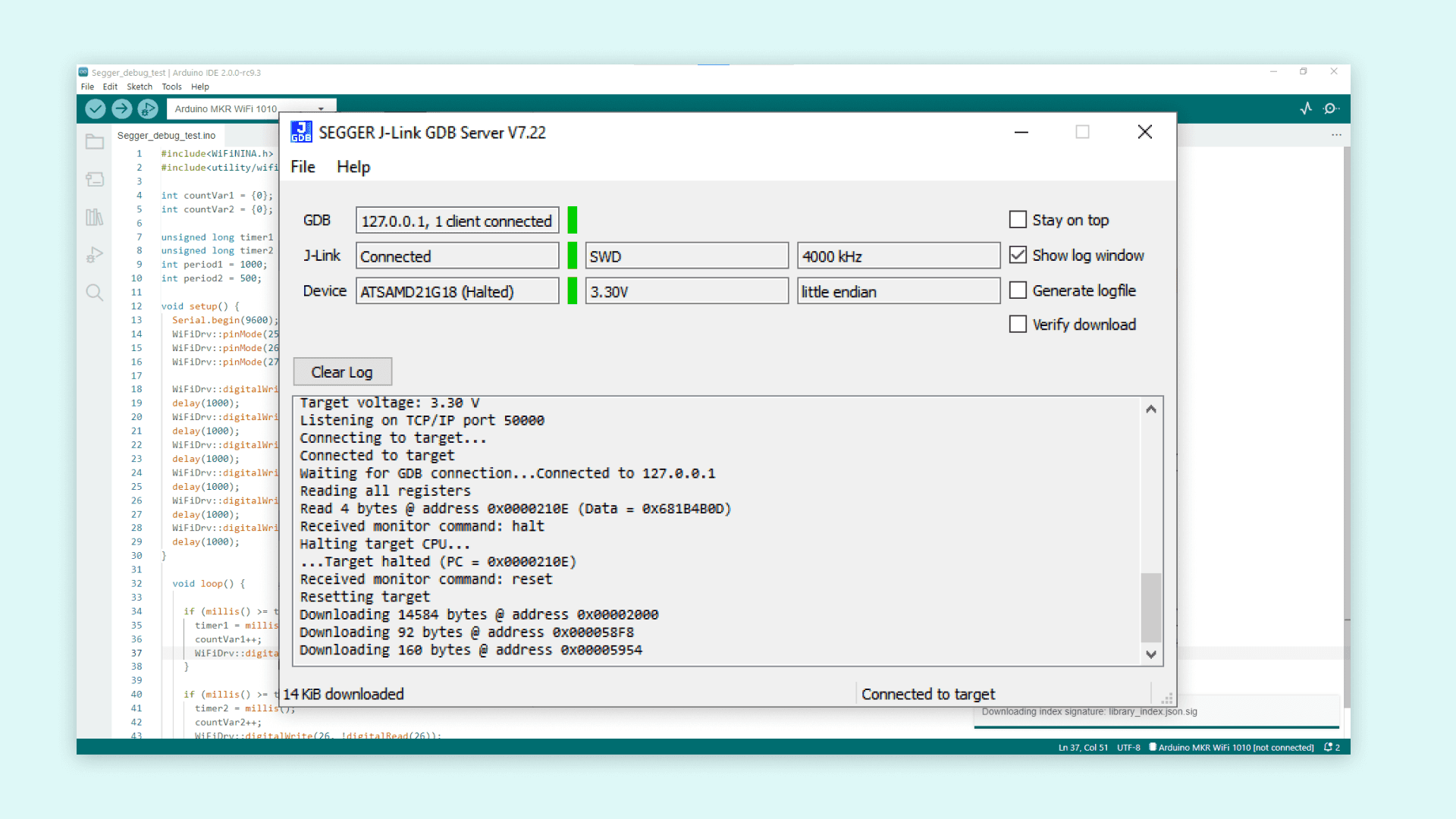 If you haven't already, download and install the Arduino IDE 2, this will be used to debug our sketch. You will also need to download the J-Link GDB Server software, here. The J-Link GDB Server is a remote server for the GNU Debugger (GDB) which allows to use a J-Link probe with GDB or any toolchain which uses GDB as debugging interface, like the Arduino IDE 2.