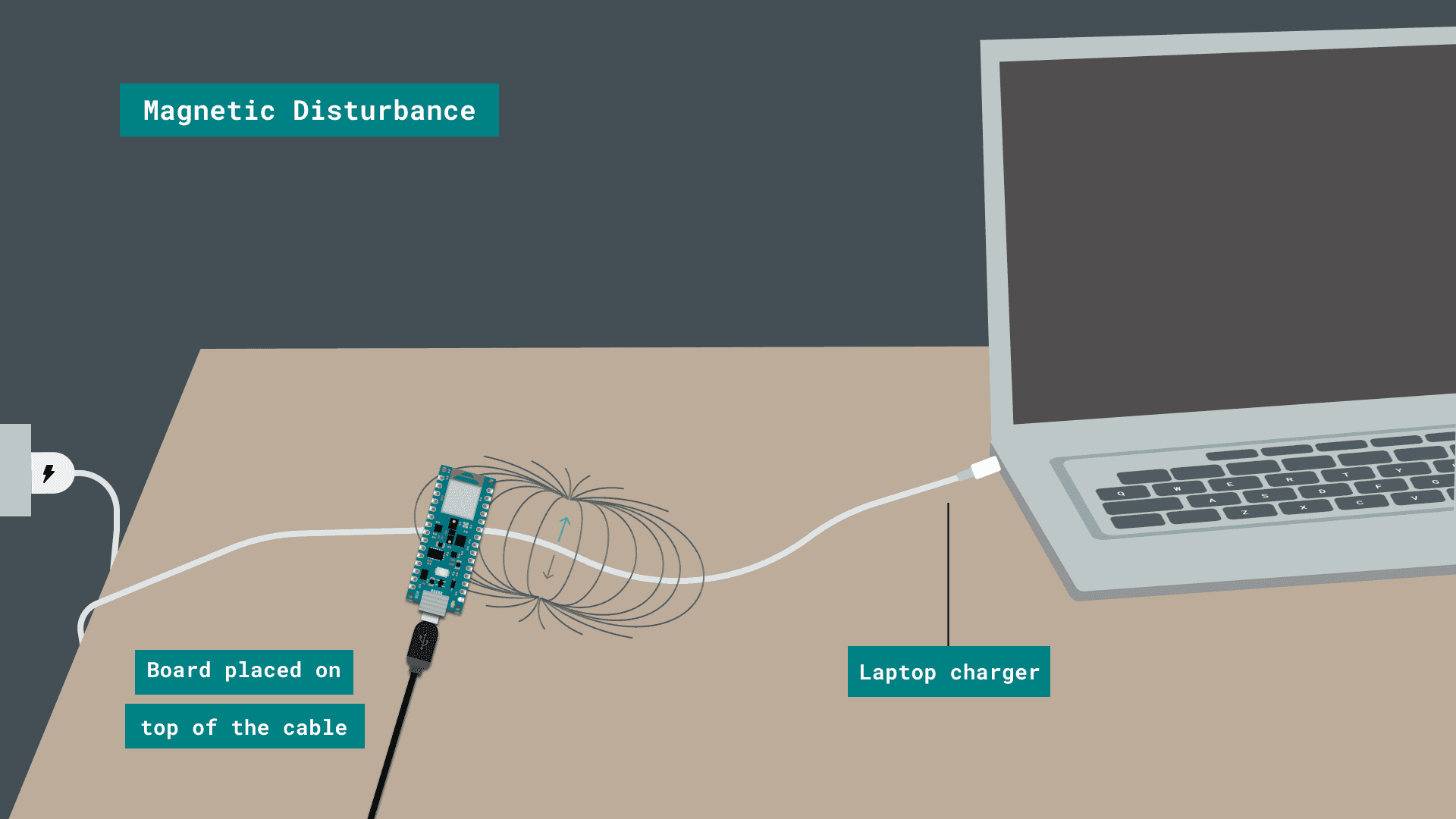 Place your board on top of the laptop's charging cord for 5-10 seconds and then move it away from it for some seconds again. While the board is close to the cord you should notice the (orange) built-in LED blinking. The intensity of the LED will vary according to the magnetic field detected.