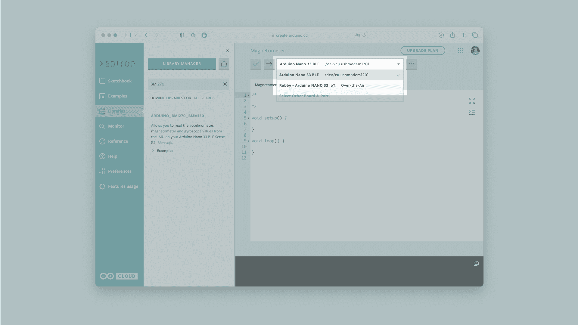 Next, connect the Nano 33 BLE Rev2 to the computer and make sure that the Cloud Editor recognizes it. If so, the board and port should appear as shown in the image below. If they don't appear, follow the instructions to install the plugin that will allow the editor to recognize your board.