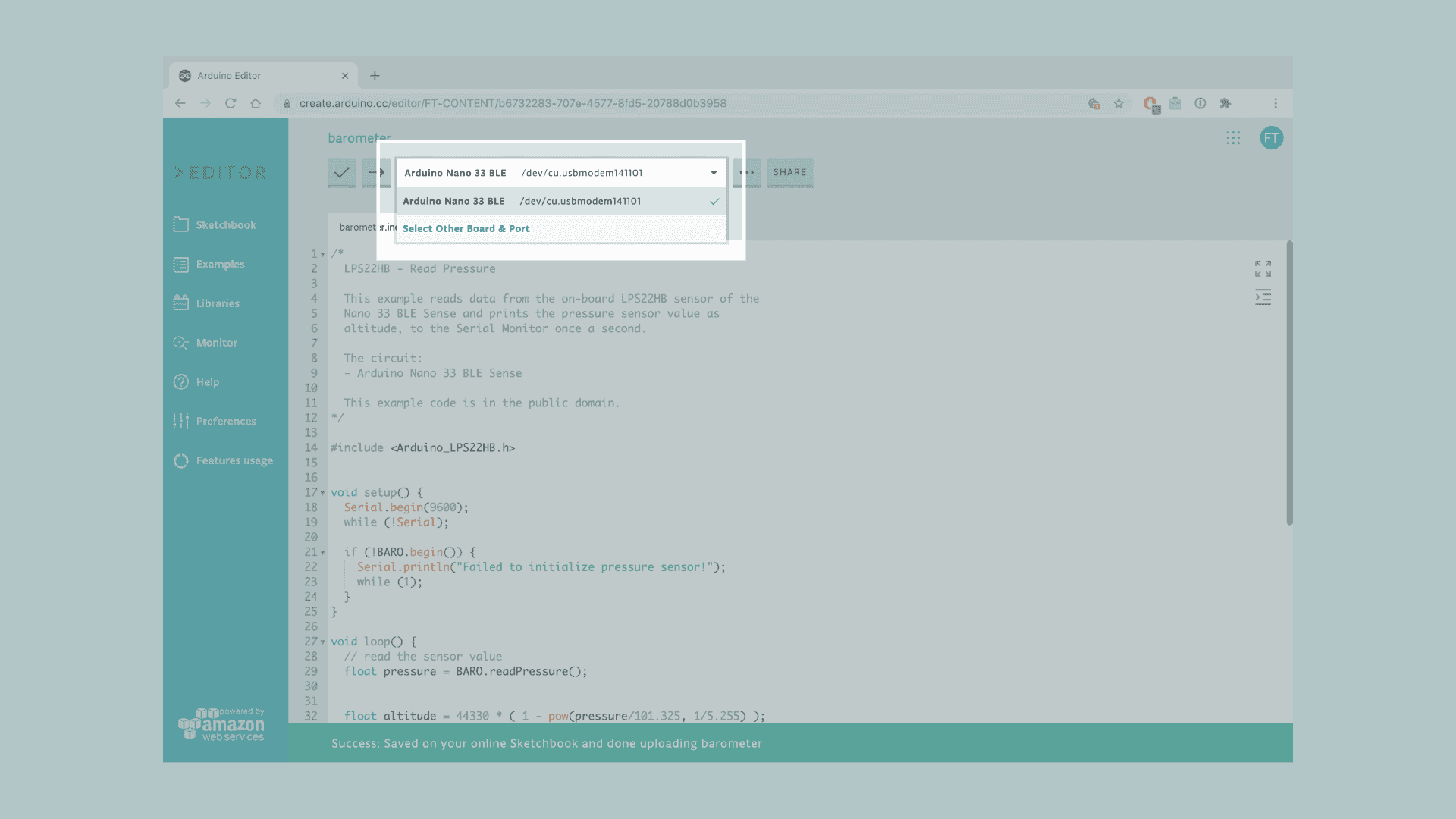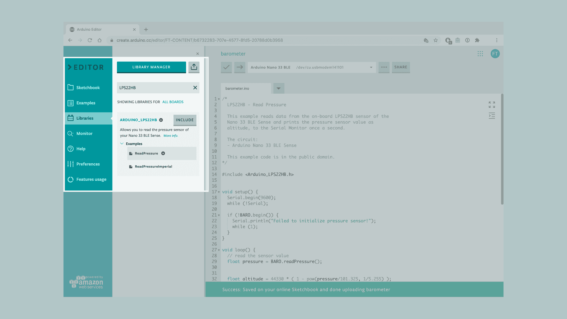 Let's start by opening the Arduino Web Editor, click on the Libraries tab and search for the LPS22HB library. Then in > Examples, open the ReadPressure sketch and once it opens, rename it as Barometer.