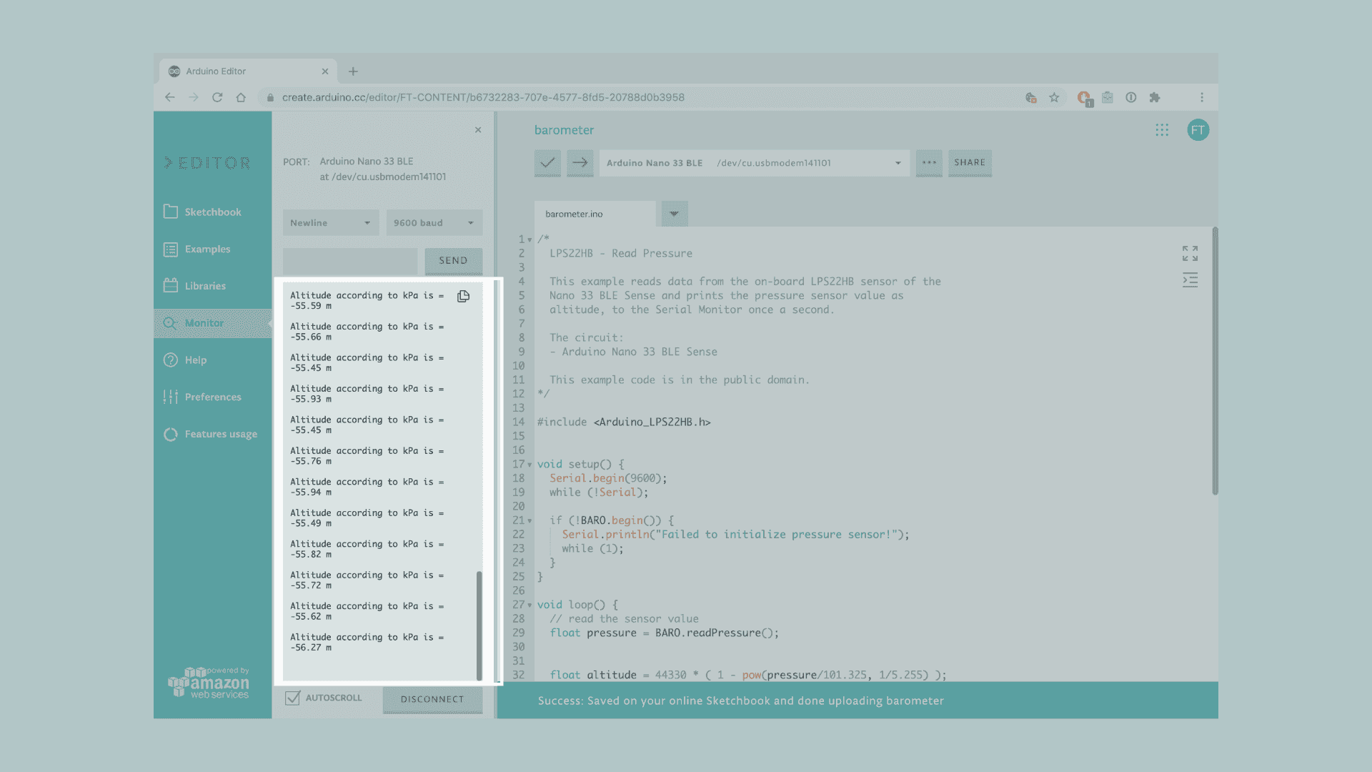 4 This example reads data from the on-board LPS22HB sensor of the Nano 33 BLE Sense, 5 converts the atmospheric pressure sensor values to altitude above sea level,6 and prints them to the Serial Monitor every second.7
