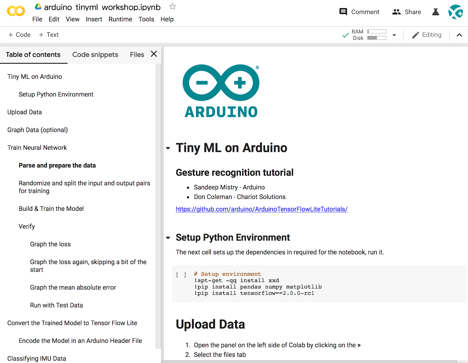 Let’s open the notebook in Colab and run through the steps in the cells – arduino_tinyml_workshop.ipynb