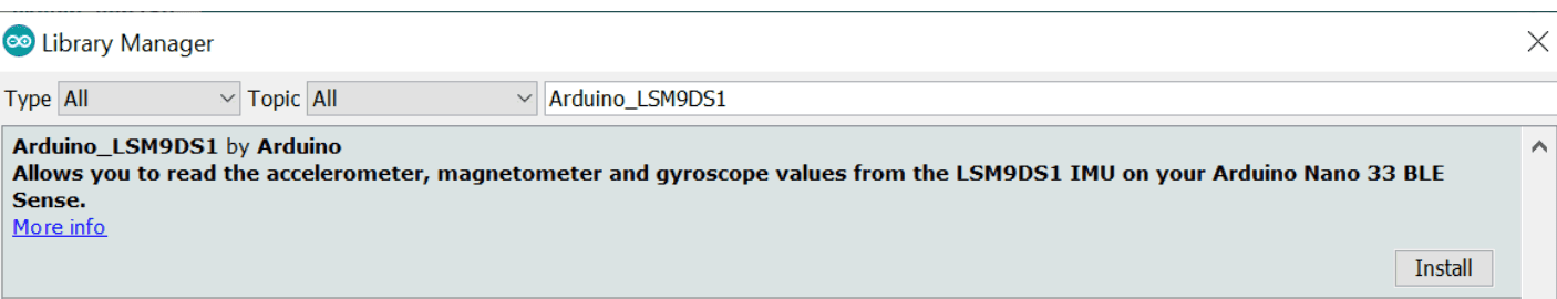 2. Also, let's make sure we have all the libraries we need installed. If we are using the online IDE, there is no need to install anything. If we are using the offline IDE, this can be done by navigating to Tools > Manage libraries..., search for Arduino_TensorFlowLite and Arduino_BMI270_BMM150, and install them both.