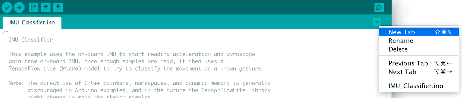 Next we will use model.h file we just trained and downloaded from Colab in the previous section in our Arduino IDE project: