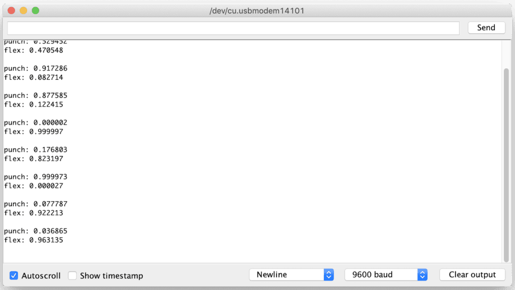 - The confidence of each gesture will be printed to the Serial Monitor (0 = low confidence, 1 = high confidence)