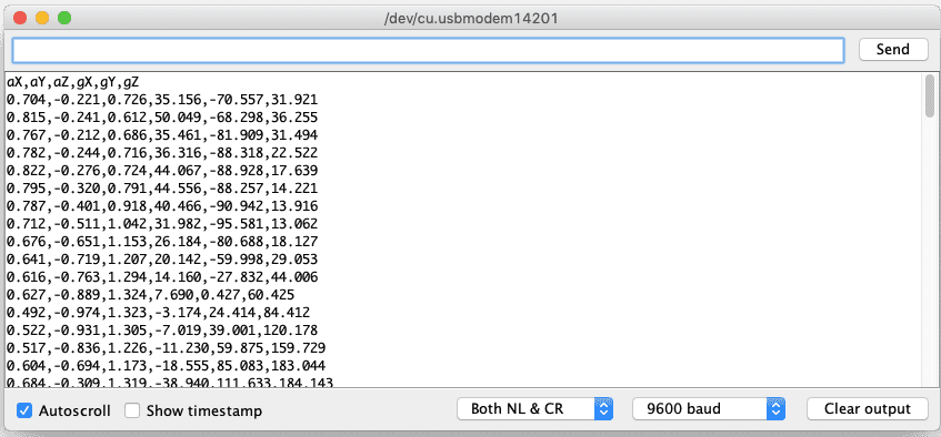 67 // print the data in CSV format68 Serial.print(aX, 3);69 Serial.print(',');70 Serial.print(aY, 3);71 Serial.print(',');72 Serial.print(aZ, 3);73 Serial.print(',');74 Serial.print(gX, 3);75 Serial.print(',');76 Serial.print(gY, 3);77 Serial.print(',');78 Serial.print(gZ, 3);79 Serial.println();80