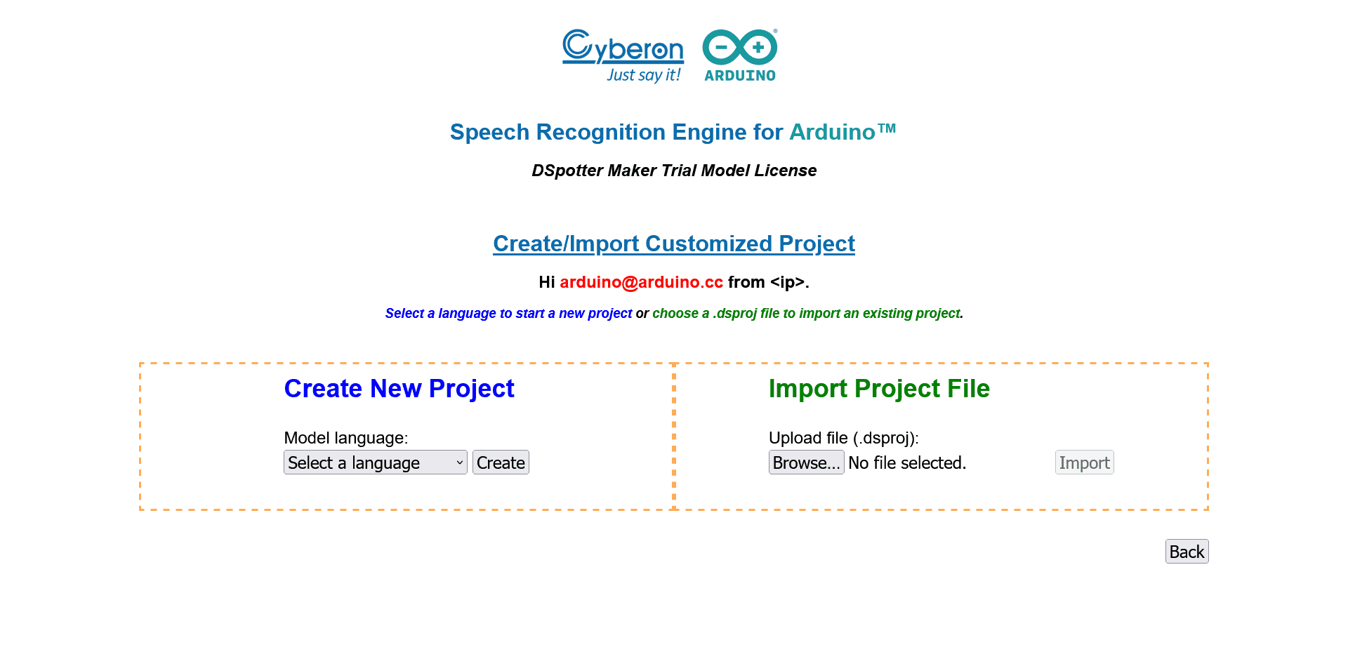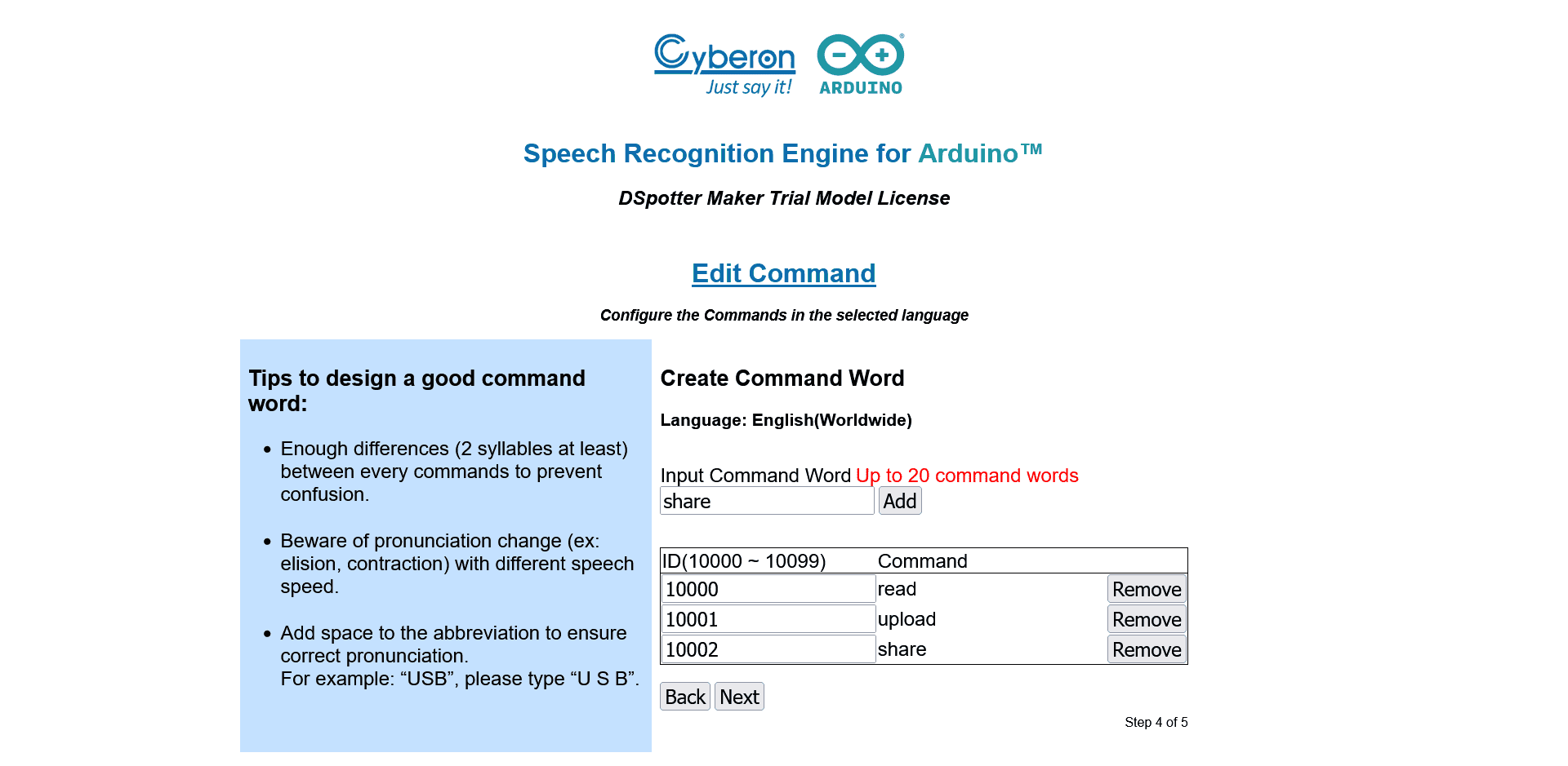 To expand the features and human interaction of your projects, you can create your own voice commands with the Arduino Speech Recognition Engine. In this section, you will learn about how to use the Cyberon Model Configuration webpage to create a new project with custom voice commands.