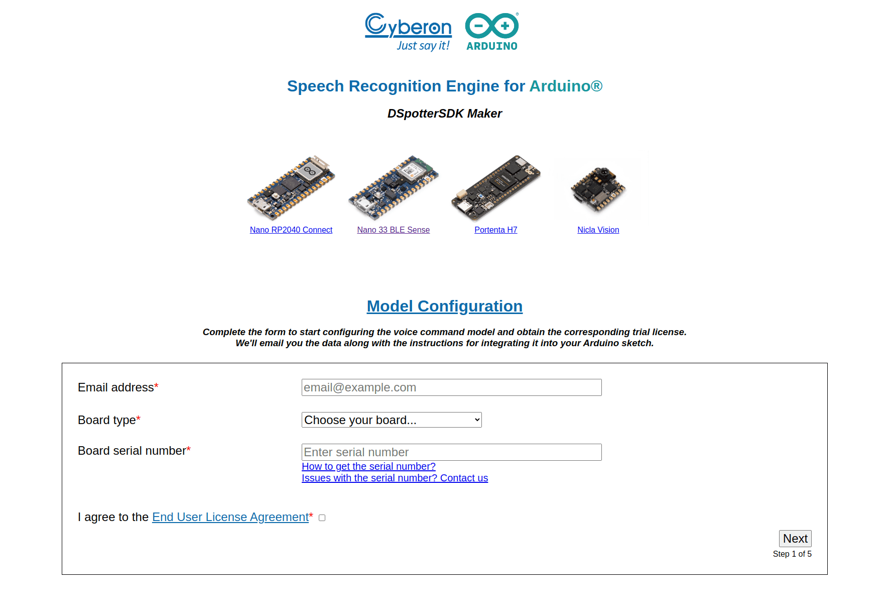 Once you have the Serial number, open: https://tool.cyberon.com.tw/ArduinoDSpotterAuth/FDMain.php