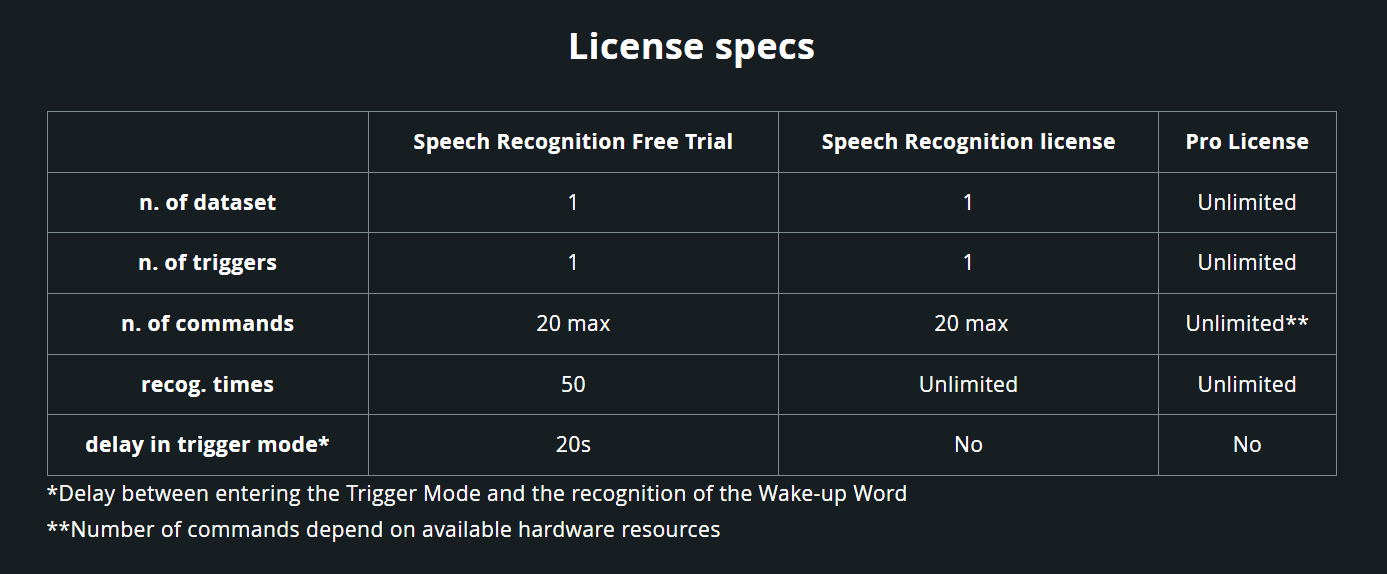 [1] Please note that the delay in Trigger mode means a 20 seconds delay between entering the trigger mode and the recognition of the wake-up word.