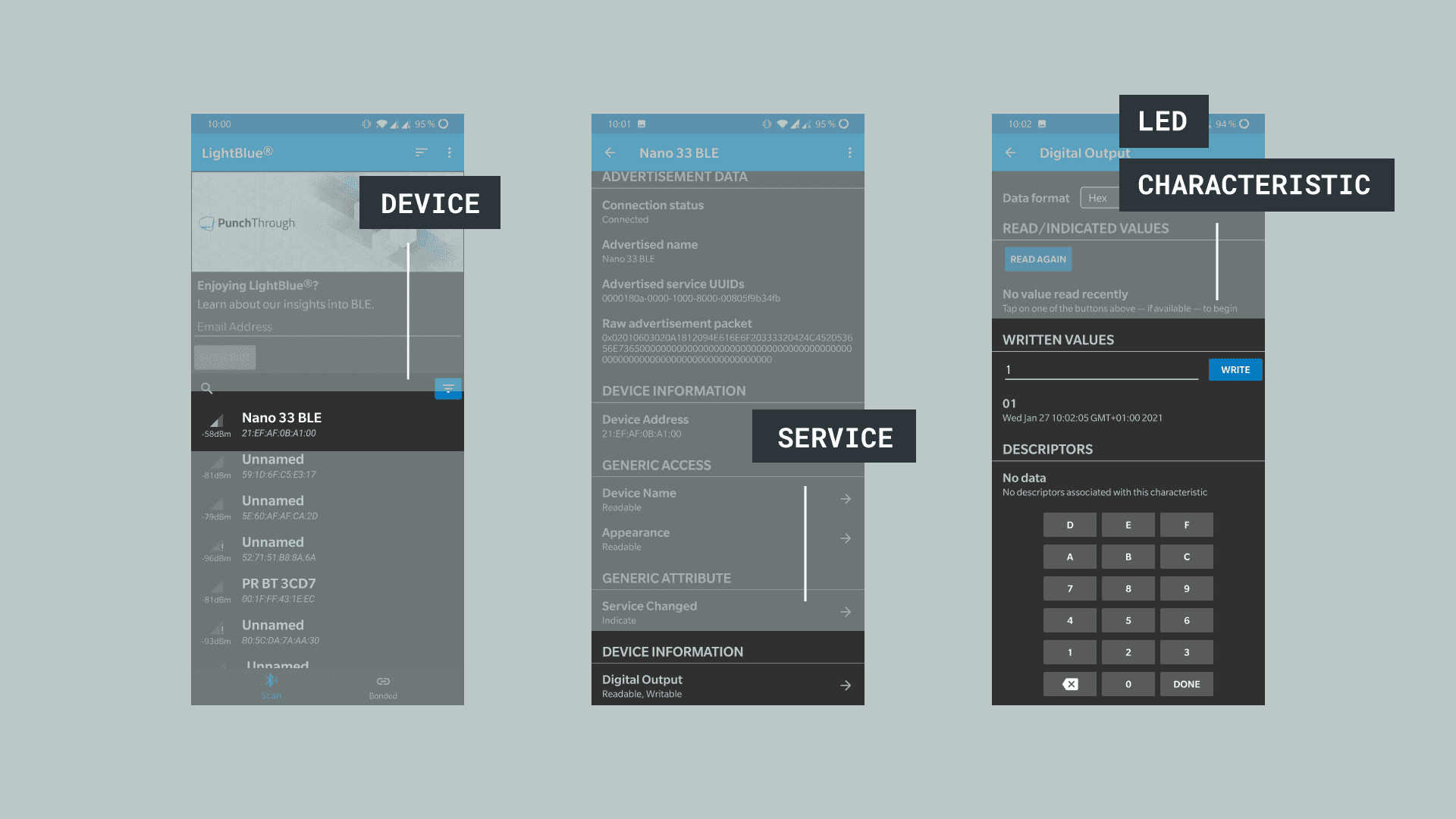 To control the RGB LED, we simply need to write 1,2 or 3 in the "WRITTEN VALUES" field to turn on the red, blue or the green LED and any other value to turn them off. This is within the "Digital Output" characteristic, which is located under "Device Information".