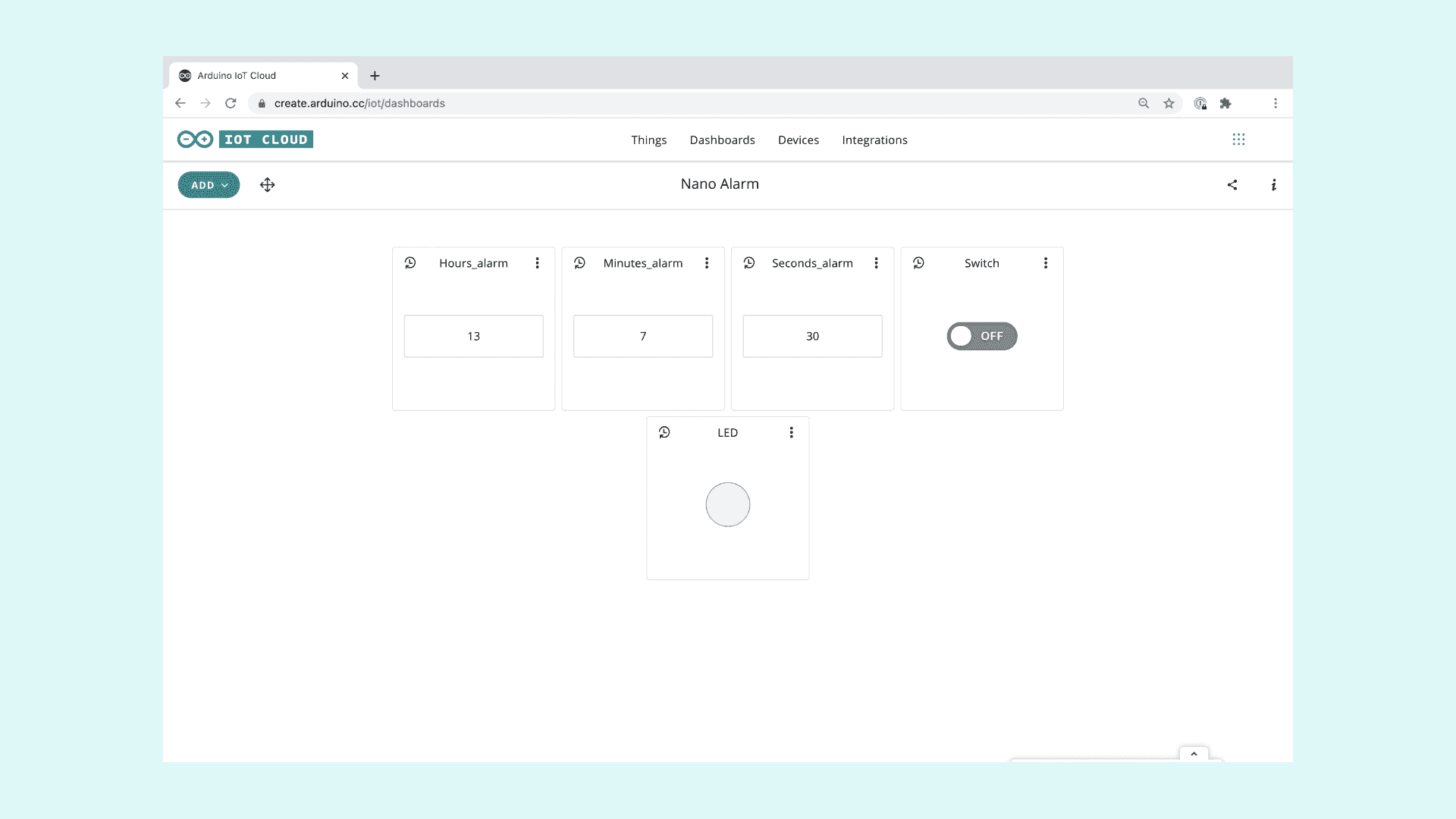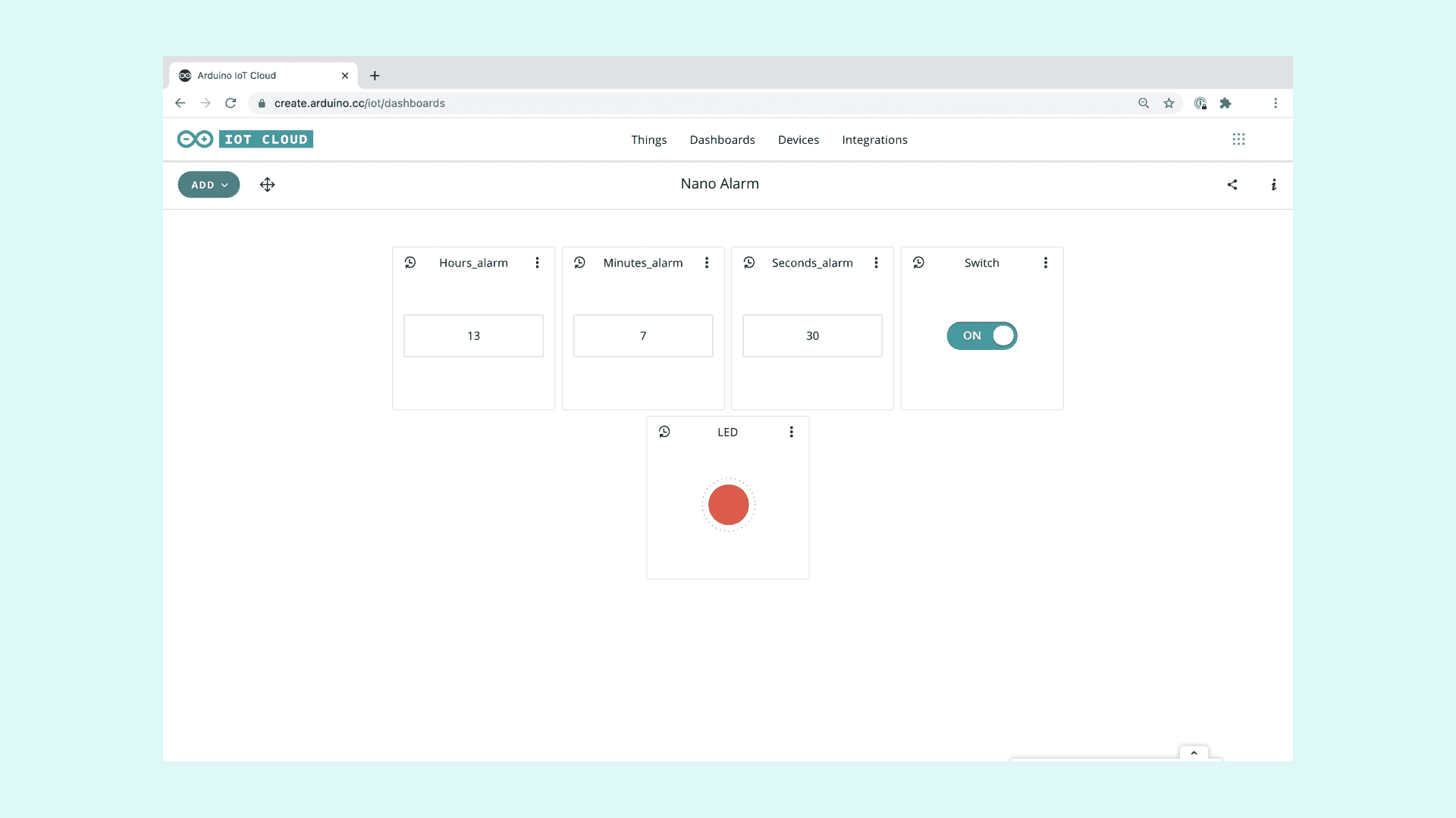 We can now go to the Dashboard tab in the Arduino Cloud to the Nano Alarm dashboard we created before. There we can set time for the alarm and activate the alarm with the switch. If the switch is on and the alarm match we will see the LED turn on.