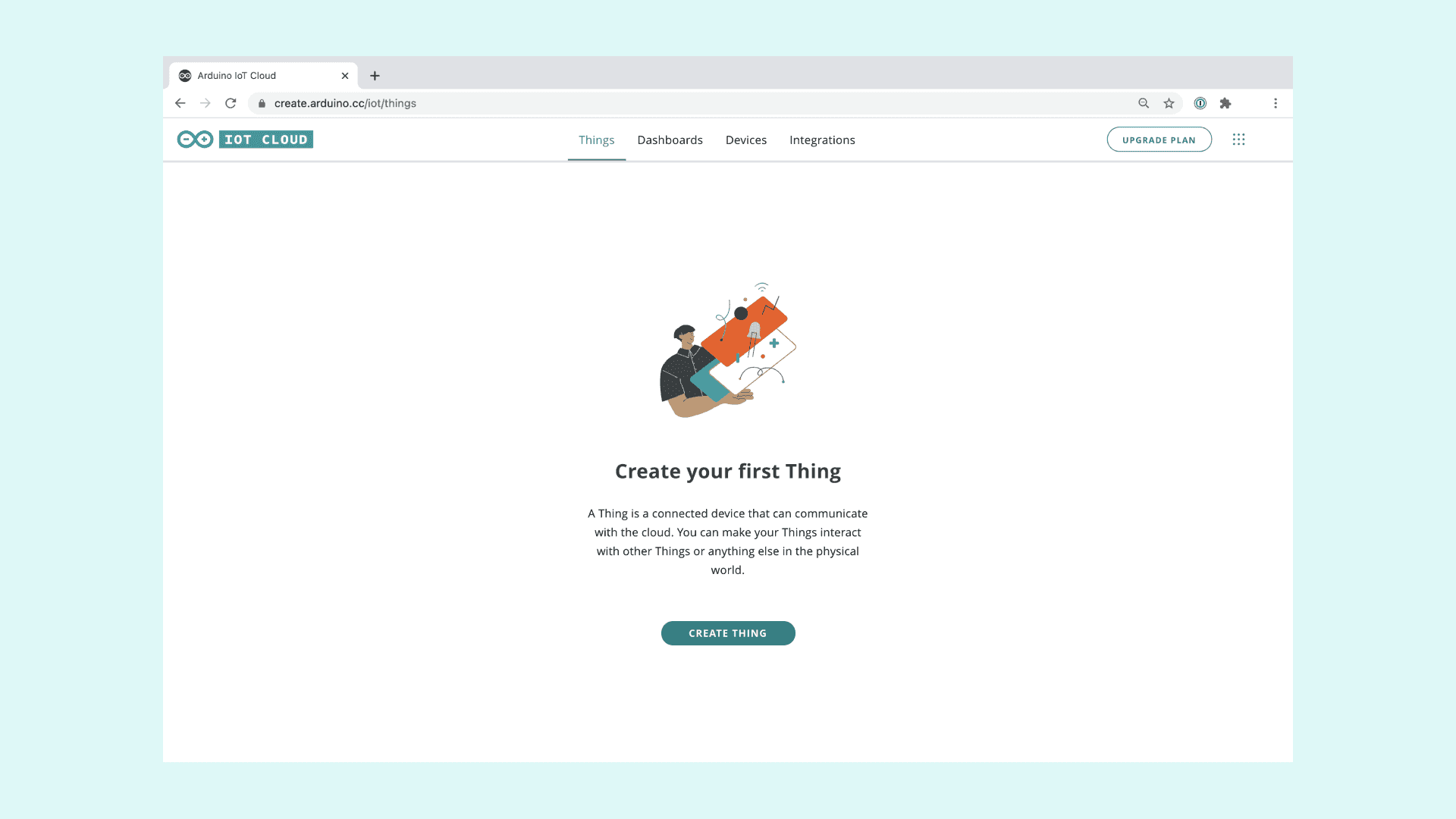 Let's start by opening the Arduino Cloud. Once we are in the Arduino Cloud, we will see the Things where we need to click the Create Thing button and rename it as Nano Alarm.