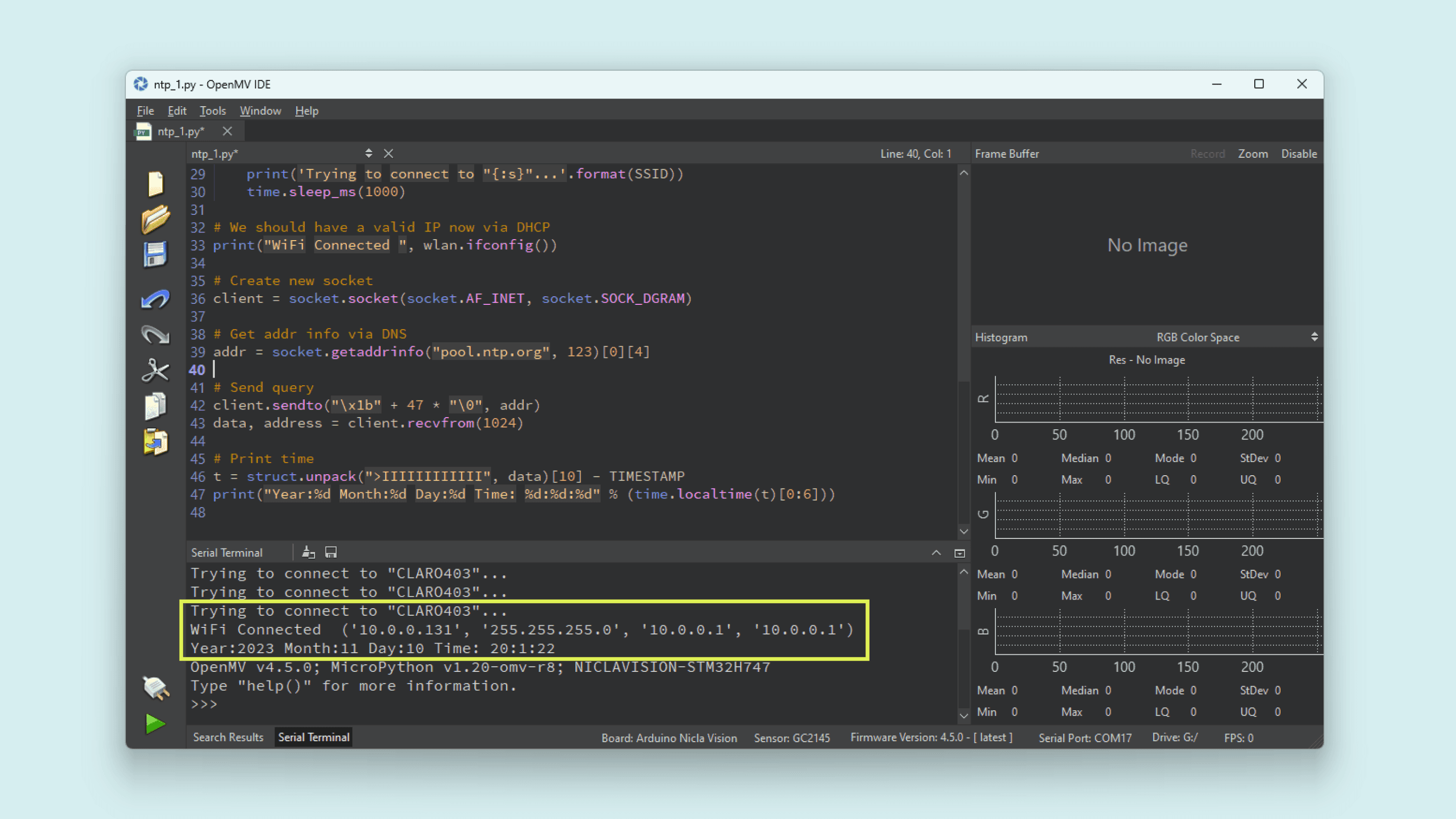 variables and run the script from the OpenMV IDE.The current time and date will be printed on the IDE serial monitor.