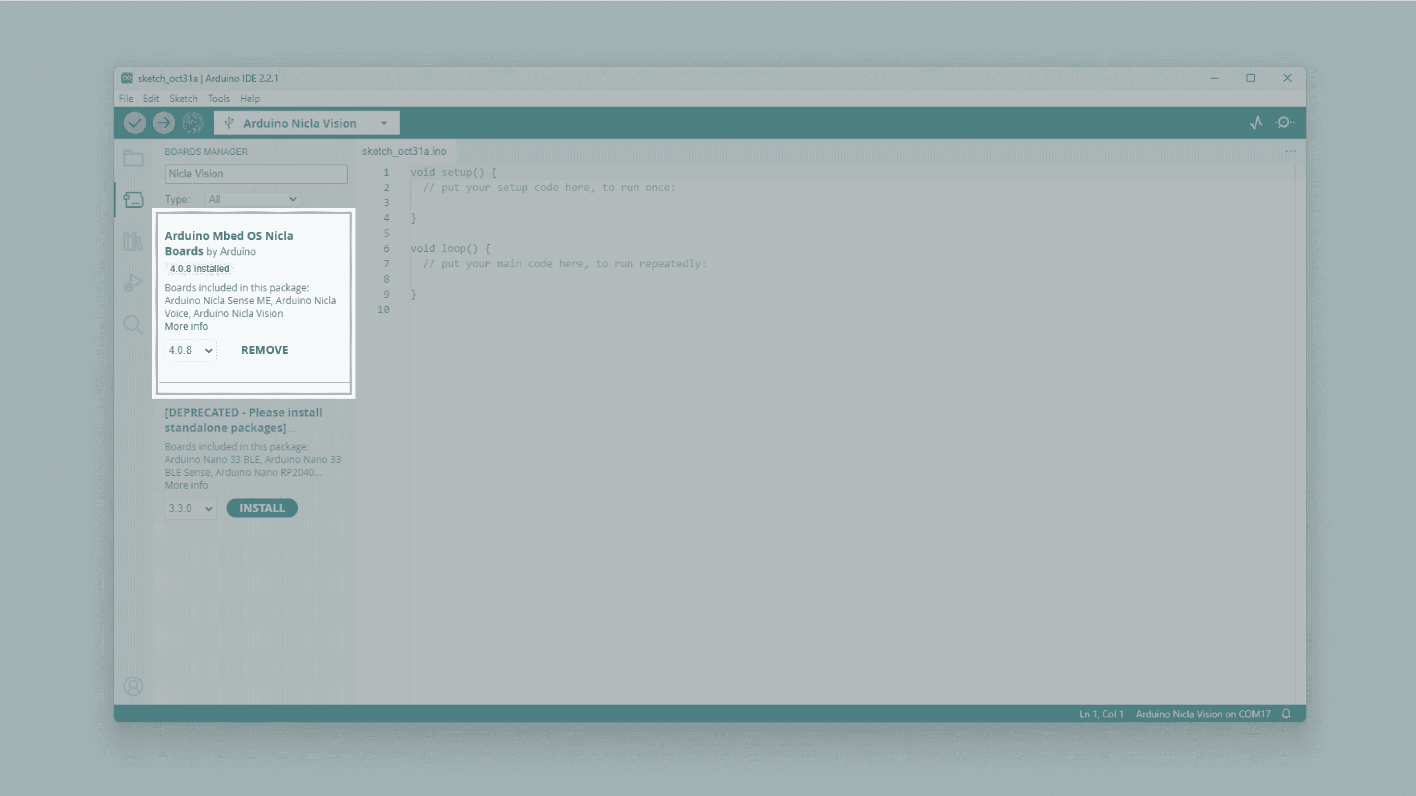 The Arduino Mbed OS Nicla Boards core contains the libraries and examples you need to work with the board's components, such as its camera and IMU. To install the core for Nicla boards, navigate to Tools > Board > Boards Manager or click the Boards Manager icon in the left tab of the IDE. In the Boards Manager tab, search for