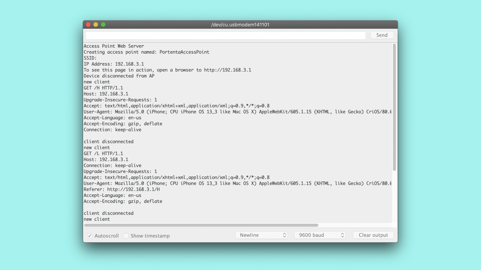 With the access point set up, you create a client server architecture where the board provides a web server communicating with the client devices over HTTP. The connected devices can then make HTTP GET requests to the server to retrieve web pages served by the web server on the board. This makes the Portenta H7 an ideal board for developing IoT solutions where external client devices can send and receive information while more complex processing tasks take place on the server.