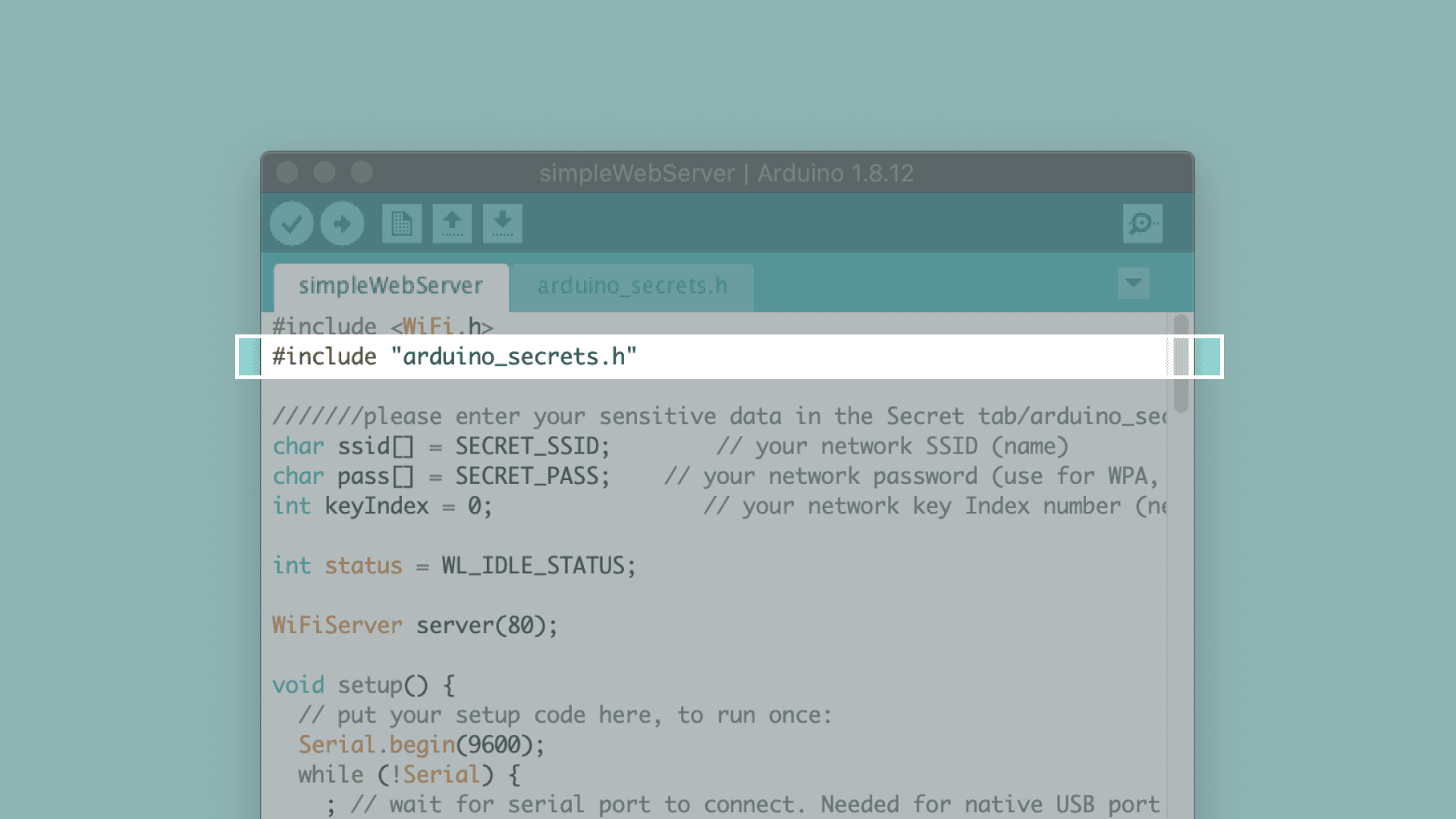 that will hold the name of the Wi-Fi network and the corresponding password. Add the following lines to your arduino_secrets.h file: