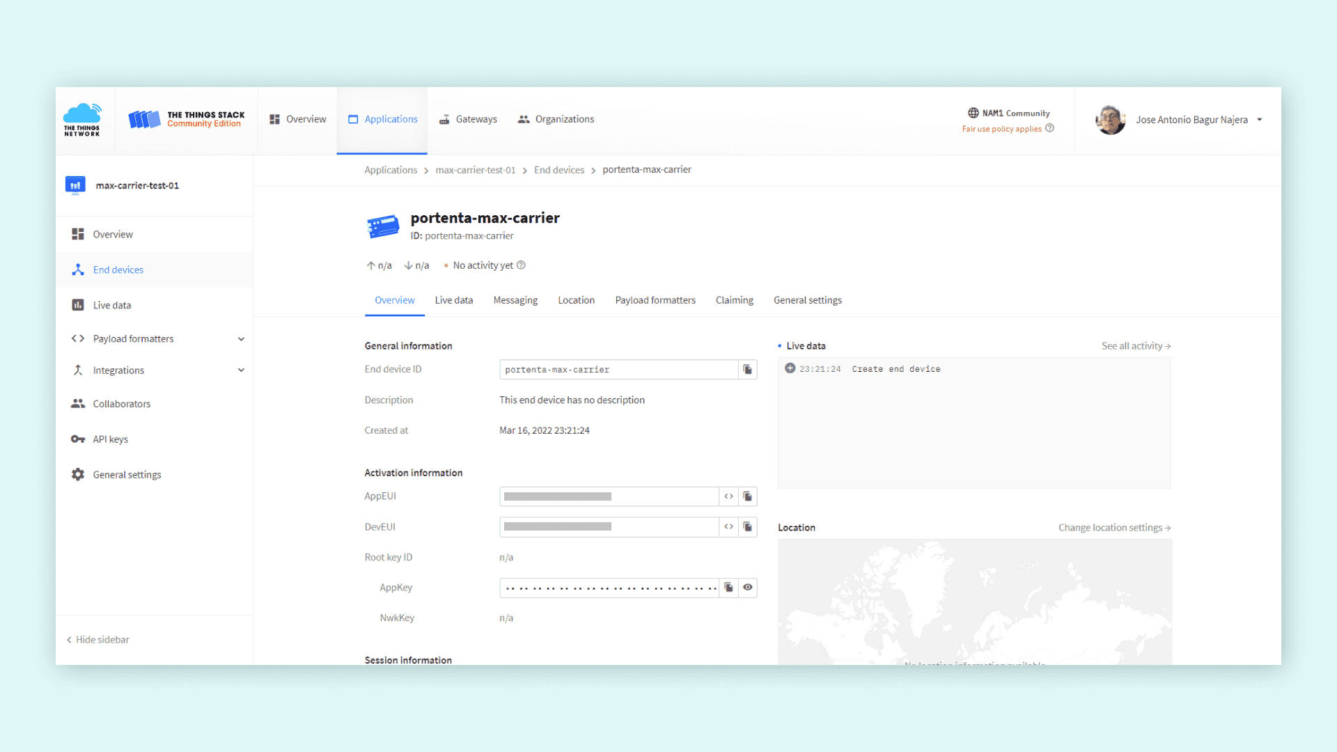 Click on Register end device; this will take you to a Device Overview page where you will see all the information related to the device. Now, you will use some of this information with your Portenta Max Carrier to send data to TTN.