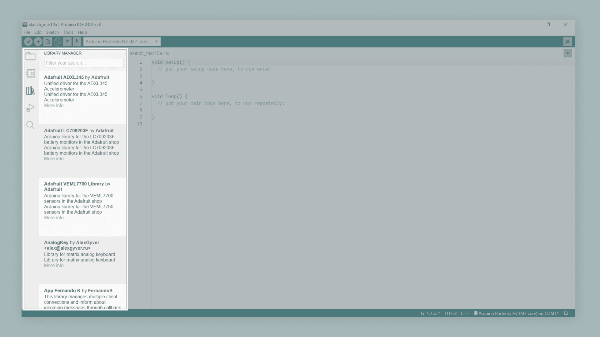 of the MKRWAN library. You can open this example by navigating to File > Examples > MKRWAN. Before uploading the sketch to the Portenta H7 board, open the MKRWANFWUpdate_standalone.ino