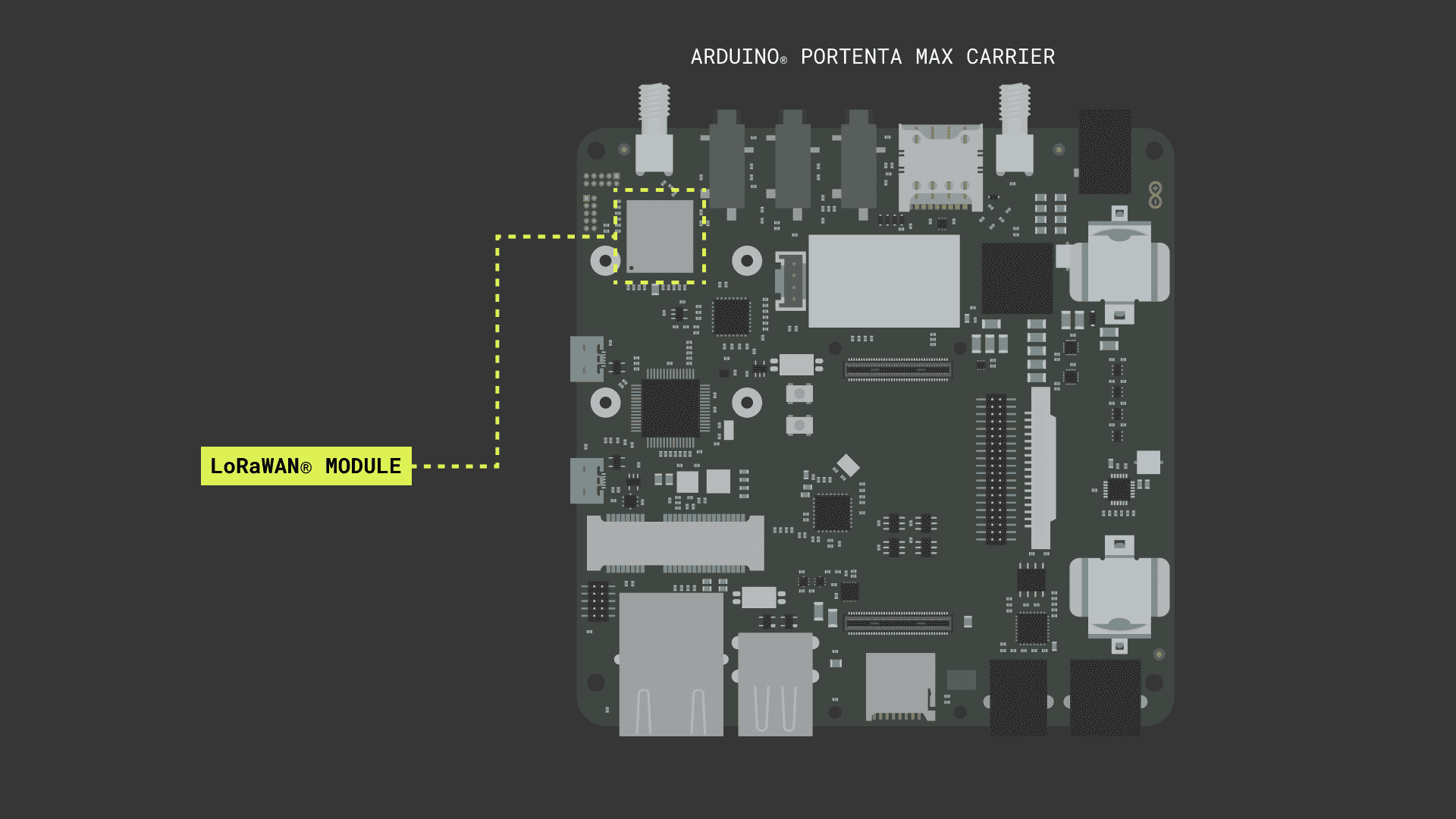 The Portenta Max Carrier provides you with an unlimited range of applications, from robotics and medical devices to industrial or automotive applications; the Max Carrier possibilities are endless. One feature that boosts Portenta's Max Carrier possibilities is its onboard LoRaWAN® module, the CMWX1ZZABZ-078 from Murata®. LoRaWAN® is a Low Power Wide Area Network (LPWAN) designed to connect low power devices to the Internet. It was developed to meet and fulfill Internet of Things (IoT) devices' requirements, such as low-power consumption and low data throughput.