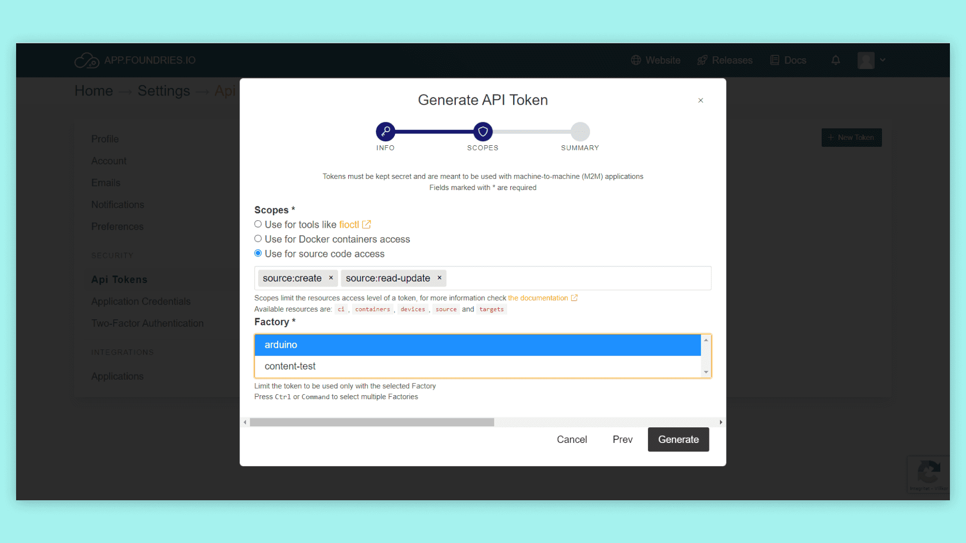To pull or push repositories, you have to generate an API key. This is done by going to the user settings on the Factory page. Click on the user drop-down menu, go into the tokens page and follow the steps of creating a new API key. When creating the API key, please make sure to select the "Use for source code access" option and the correct Factory that you want to use the key for. This token will be used as the password for all git operations while the username can be anything, except an empty string.