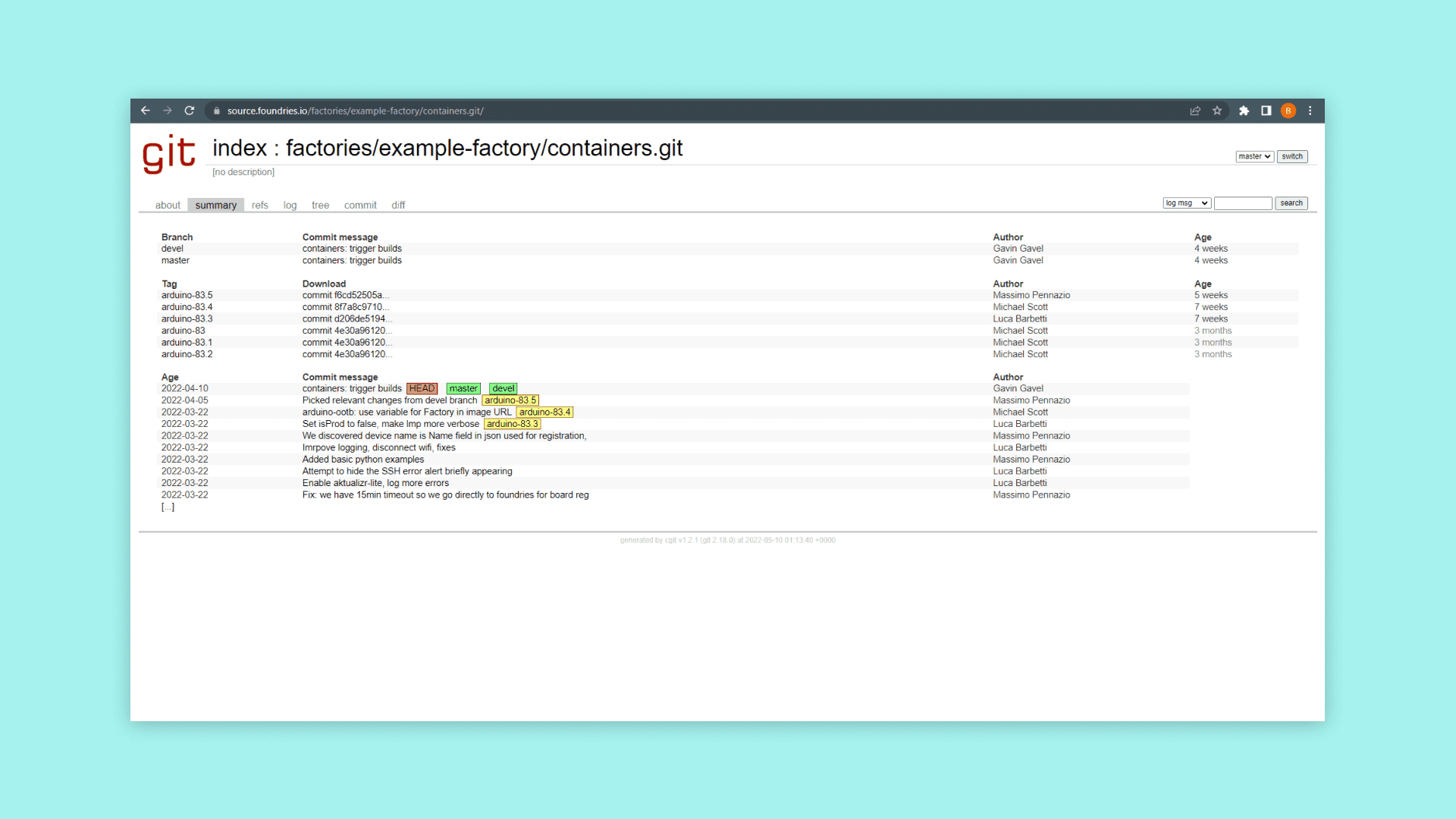 to finally push the changes to the repo. If you push the commit to "containers.git" a new target will automatically build on your FoundriesFactory, you can inspect it on the "Targets" page.Building and Running the Container